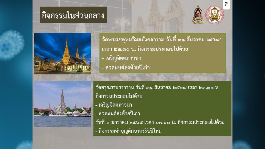 “ขณะที่กิจกรรมสวดมนต์ข้ามปี ส่วนกลางจัดที่วัดพระเชตุพนวิมลมังคลาราม วันที่ 31 ธ.ค. 64 เวลา 22.30 น. กิจกรรมประกอบด้วย เจริญจิตตภาวนาและสวดมนต์ส่งท้ายปีเก่า วัดอรุณราชวราราม วันที่ 31 ธ.ค. 64 เวลา 23.30 น. กิจกรรมประกอบด้วย เจริญจิตตภาวนา สวดมนต์ส่งท้ายปีเก่า วันที่ 1 ม.ค. 65 เวลา 07.00 น. พิธีตักบาตรรับปีใหม่ ส่วนภูมิภาค สำนักงานวัฒนธรรมจังหวัด จัดกิจกรรมสวดมนต์ข้ามปีอย่างน้อยจังหวัดละ 1 แห่ง กิจกรรมพิเศษที่จัดขึ้นใน 3 ภูมิภาค ภาคเหนือ จ.เชียงราย ภาคตะวันออกเฉียงเหนือ จ.อุดรธานี และภาคใต้ จ.สุราษฎร์ธานี ส่งเสริมบูรณาการความร่วมมือทางศาสนา ส่งเสริมประเพณีวัฒนธรรมท้องถิ่นในพื้นที่ และส่งเสริมภาพลักษณ์ที่ดีด้านการท่องเที่ยวในมิติศาสนา” โฆษกศบค. กล่าว.-สำนักข่าวไทย