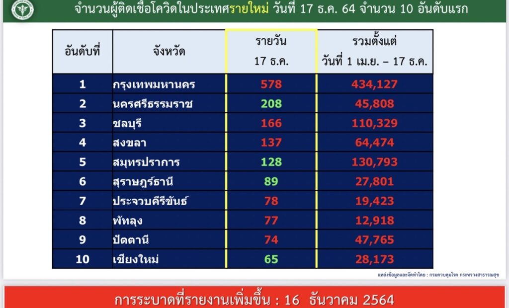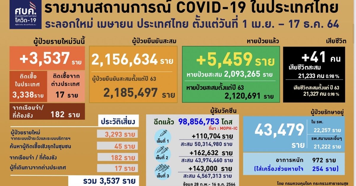 พญ.อภิสมัย ศรีรังสรรค์ ผู้ช่วยโฆษกศูนย์บริหารสถานการณ์โควิด 19 (ศบค.) แถลงสถานการณ์แพร่ระบาดของเชื้อโควิด-19 วันนี้(17 ธ.ค.) พบผู้ติดเชื้อรายใหม่ 3,537 ราย แบ่งเป็นติดเชื้อในประเทศ 3,338 ราย ติดเชื้อจากต่างประเทศ 17 ราย จากเรือนจำและที่ต้องขัง 182 ราย ผู้ป่วยหายแล้ว 5,459 ราย ผู้ป่วยรักษาอยู่ 43,479 ราย รักษาในโรงพยาบาล 22,257 ราย รักษาในโรงพยาบาลสนามและอื่นๆ 21,222 ราย อาการหนัก 972 ราย ใส่เครื่องช่วยหายใจ 254 ราย และมีผู้เสียชีวิต 41 คน เป็นชาย 21 ราย หญิง 20 ราย คนไทย 39 คน เมียนมา 1 คน และอังกฤษ 1 คน โดยผู้เสียชีวิตอายุ 60 ปีขึ้นไป 33 คน อายุน้อยกว่า 60 ปีมีโรคเรื้อรัง 6 คน ไม่มีประวัติโรคเรื้อรัง 2 คน ทั้งนี้การเสียชีวิตยังพบว่าเป็นการสัมผัสและติดเชื้อจากคนในครอบครัว โดยยอดการติดเชื้อ 10 อันดับแรกได้แก่ กทม. 578 ราย นครศรีธรรมราช 208 ราย ชลบุรี 166 ราย สงขลา 137 ราย สมุทรปราการ 128 ราย สุราษฎร์ธานี 89 ราย ประจวบคีรีขันธ์ 78 ราย พัทลุง 77 ราย ปัตตานี 74 ราย และเชียงใหม่ 65 ราย