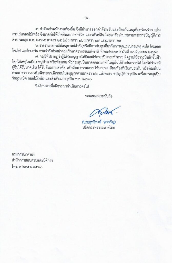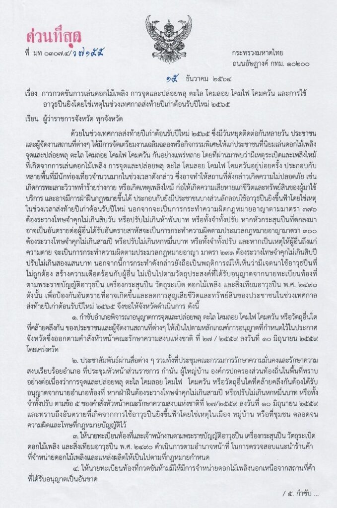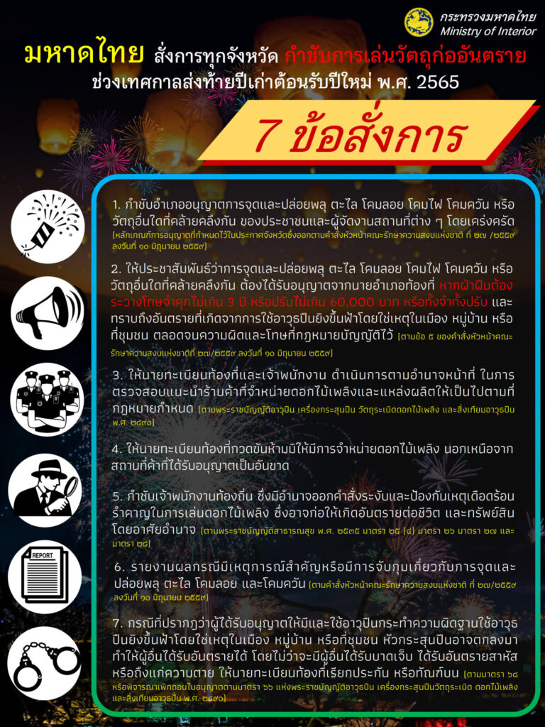 นายสุทธิพงษ์ จุลเจริญ ปลัดกระทรวงมหาดไทย กล่าวว่า เพื่อเป็นการป้องกันอันตรายที่อาจเกิดขึ้นและเป็นการลดการสูญเสียชีวิตและทรัพย์สินของพี่น้องประชาชนในช่วงเทศกาลส่งท้ายปีเก่าต้อนรับปีใหม่ 2565 ทั้งอันตรายจากพลุ ตะไล โคมลอย โคมไฟ โคมควัน และเหตุจากการกระทำที่ไม่เหมาะสม ตนจึงได้สั่งการไปยังผู้ว่าราชการจังหวัดทุกจังหวัดกำชับนายอำเภอในการพิจารณาอนุญาตประชาชนหรือผู้จัดงานสถานที่ต่าง ๆ ในการจุดและปล่อยพลุ ตะไล โคมลอย โคมไฟ โคมควัน หรือวัตถุอื่นใดที่คล้ายคลึงกัน ต้องเป็นไปตามหลักเกณฑ์ที่กฎหมายกำหนดอย่างเคร่งครัด รวมทั้งประชาสัมพันธ์ผ่านสื่อต่าง ๆ ในพื้นที่ทุกช่องทางอย่างต่อเนื่องว่า การจุดและปล่อยพลุ ตะไล โคมลอย โคมไฟ โคมควัน หรือวัตถุอื่นใดที่คล้ายคลึงกัน ต้องได้รับอนุญาตจากนายอำเภอในพื้นที่อำเภอนั้น ๆ หากฝ่าฝืนจะมีโทษทั้งจำทั้งปรับ และให้นายทะเบียน/เจ้าพนักงานตามกฎหมาย เข้าตรวจสอบแนะนำร้านค้าที่จำหน่ายดอกไม้เพลิงและแหล่งผลิตต้องปฏิบัติเป็นไปตามที่กฎหมายกำหนด และห้ามร้านค้าที่ไม่ได้รับอนุญาต จำหน่ายดอกไม้เพลิง ฯลฯ เป็นอันขาด พร้อมทั้งกำชับเจ้าพนักงานท้องถิ่นในพื้นที่ หากพบว่าจะก่อให้เกิดความเดือดร้อนรำคาญจากการเล่นดอกไม้เพลิงในพื้นที่ ให้พิจารณาออกคำสั่งห้ามเพื่อเป็นการระงับและป้องกันเหตุ