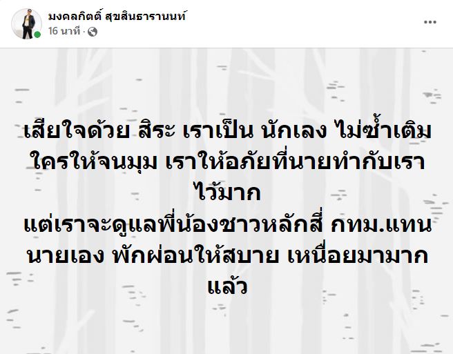 นายมงคลกิตติ์ สุขสินธารานนท์ ส.ส.บัญชีรายชื่อ หัวหน้าพรรคไทยศรีวิไลย์ โพสต์ข้อความผ่านเฟซบุ๊ก “มงคลกิตติ์ สุขสินธารานนท์” ภายหลังศาลรัฐธรรมนูญอ่านคำวินิจฉัย กรณี พล.ต.อ.เสรีพิศุทธ์ เตมียเวส ส.ส.บัญชีรายชื่อ หัวหน้าพรรคเสรีรวมไทย และ ส.ส.ฝ่ายค้าน ร้องว่า นายสิระ เจนจาคะ ส.ส.เขตหลักสี่ พรรคพลังประชารัฐ (พปชร.) ต้องคำพิพากษาถึงที่สุดปมคดีฉ้อโกง ถือว่าขัดคุณสมบัติการเป็น ส.ส.หรือไม่ โดยศาลรัฐธรรมนูญได้วินิจฉัยให้ นายสิระ ขาดคุณสมบัติการเป็น ส.ส. โดยระบุว่า “เสียใจด้วย สิระ เราเป็น นักเลง ไม่ซ้ำเติมใครให้จนมุม เราให้อภัยที่นายทำกับเราไว้มาก แต่เราจะดูแลพี่น้องชาวหลักสี่ กทม.แทนนายเอง พักผ่อนให้สบาย เหนื่อยมามากแล้ว” .-สำนักข่าวไทย.