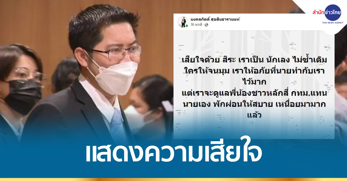 กรุงเทพฯ 22 ธ.ค. – “เต้ มงคลกิตติ์” โพสต์เฟซบุ๊ก แสดงความเสียใจกับ “สิระ”พ้น ส.ส. บอกพักผ่อนให้สบาย