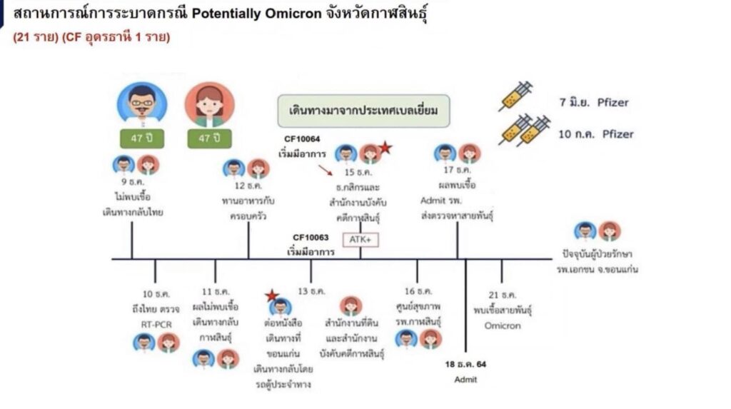 พญ.อภิสมัย ยังกล่าวอีกว่า การแพร่ระบาดของสายพันธุ์ โอไมครอน ในประเทศไทย พบแล้ว 205 ราย โดยล่าสุดที่ประชุม EOC รายงานว่า เป็นผู้ป่วยจากจังหวัดกาฬสินธุ์ สามีภรรยาเดินทางมาจากเบลเยียม ทั้งคู่อายุ 47 ปี โดยเข้ามาประเทศไทยด้วยเงื่อนไขที่จะต้องตรวจ RT-PCR ก่อนเดินทาง และเมื่อเดินทางถึงประเทศไทย ผลเป็นลบ ก่อนที่จะเดินทางกลับกาฬสินธุ์ และได้ไปรับประทานอาหารกับครอบครัวที่ร้านอาหาร ซึ่งเป็นพื้นที่ปิด เริ่มมีอาการวันที่ 13 และ 15 ธันวาคม โดยทั้ง 2 คนเดินทางไปธนาคาร และสถานที่ราชการหลายแห่ง การโดยสารรถตู้ประจำทางไปจังหวัดขอนแก่น พบปะผู้คน และเข้ารักษาตัวในโรงพยาบาล ตรวจ RT-PCR ยืนยันเป็นบวก และตรวจสายพันธุ์ยืนยันเป็นโอไมครอนจากคลัสเตอร์ดังกล่าว ทำให้มีผู้ติดเชื้อยืนยันแล้ว 21 คน โดยล่าสุดรายงานผู้เดินทางจากต่างประเทศ พบผู้ติดเชื้อสายพันธุ์โอไมครอนเพิ่มขึ้นเป็นร้อยละ 50 ของผู้เดินทางเข้าประเทศ ทำให้หลายหน่วยงานเริ่มยกระดับความเข้มงวดการจัดงานช่วงเทศกาลปีใหม่ หรือบางหน่วยงานยกเลิกการจัดเทศกาลปีใหม่ บางร้านอาหารประกาศปิด เพื่อเตรียมมาตรการให้รัดกุมมากขึ้น เพราะเชื่อดังกล่าวถ้าเราอยากได้รวดเร็วและติดง่าย