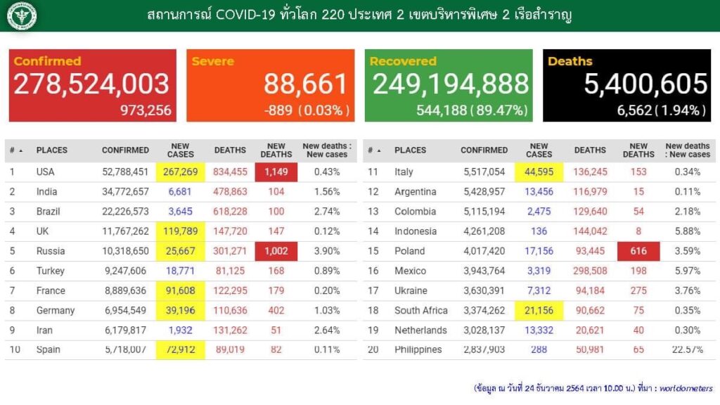 ขณะที่สถานการณ์ผู้ติดเชื้อทั่วโลก 278 ล้านราย เสียชีวิตแล้วกว่า 5.4 ล้านคน สหรัฐอเมริกามีผู้ติดเชื้อมากที่สุด 52.7 ล้านราย อินเดีย 34.7 ล้านราย บราซิล 22.2 ล้านราย สหราชอาณาจักร 11.7 ล้านราย รัสเซีย 10 ล้านราย โดยมีประเทศที่มีการแพร่ระบาดสายพันธุ์โอมิครอน ยืนยันแล้ว 98 ประเทศ ที่สหรัฐอเมริกา ยืนยันการแพร่ระบาดครบ 50 รัฐแล้ว ซึ่งการแพร่ระบาดเพิ่มขึ้นเป็น 2 เท่าอย่างรวดเร็ว ส่วนการแพร่ระบาดในทวีปเอเชียที่มักจะตามหลังทวีปยุโรป ดังนั้นจึงนอนใจไม่ได้ เพราะเมื่อทวีปยุโรปมีการแพร่ระบาดของเชื้อดังกล่าวลดลง ทวีปเอเชียจะมีการแพร่ระบาดเพิ่มขึ้น