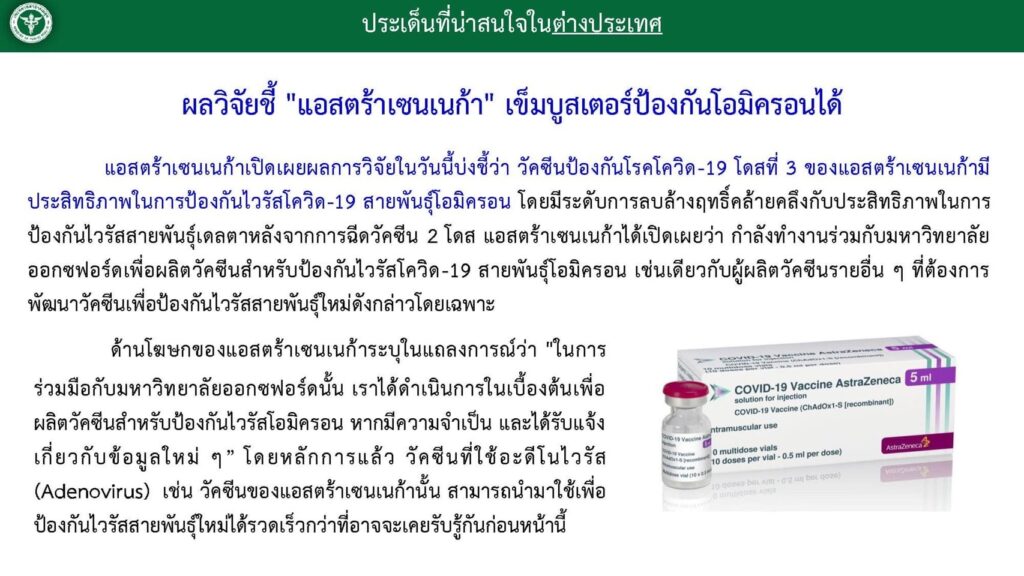ทั้งนี้ กระทรวงสาธารณสุข เน้นย้ำทุกโรงพยาบาล ระบบสาธารณสุขต่างๆ ขอให้เตรียมความพร้อม ข้าราชการทุกภาคส่วน ในช่วงเทศกาลปีใหม่นี้ รวมทั้งศูนย์กักกันในชุมชน community isolation หรือการจัดทีมรองรับการแพร่ระบาด home isolation ส่วนการให้วัคซีนแอสตราเซเรกา ที่จะให้เป็นวัคซีน บูสเตอร์ เข็มที่ 3 มีแนวโน้มการป้องกันสายพันธุ์โอมิครอน ได้อย่างมีประสิทธิภาพ ดังนั้นจึงขอเชิญชวนให้ผู้ที่ได้รับวัคซีนครบ 2 เข็มแล้วไปรับวัคซีนกระตุ้นเข็มที่ 3 ได้ ยืนยันขณะนี้มีวัคซีนเพียงพอ