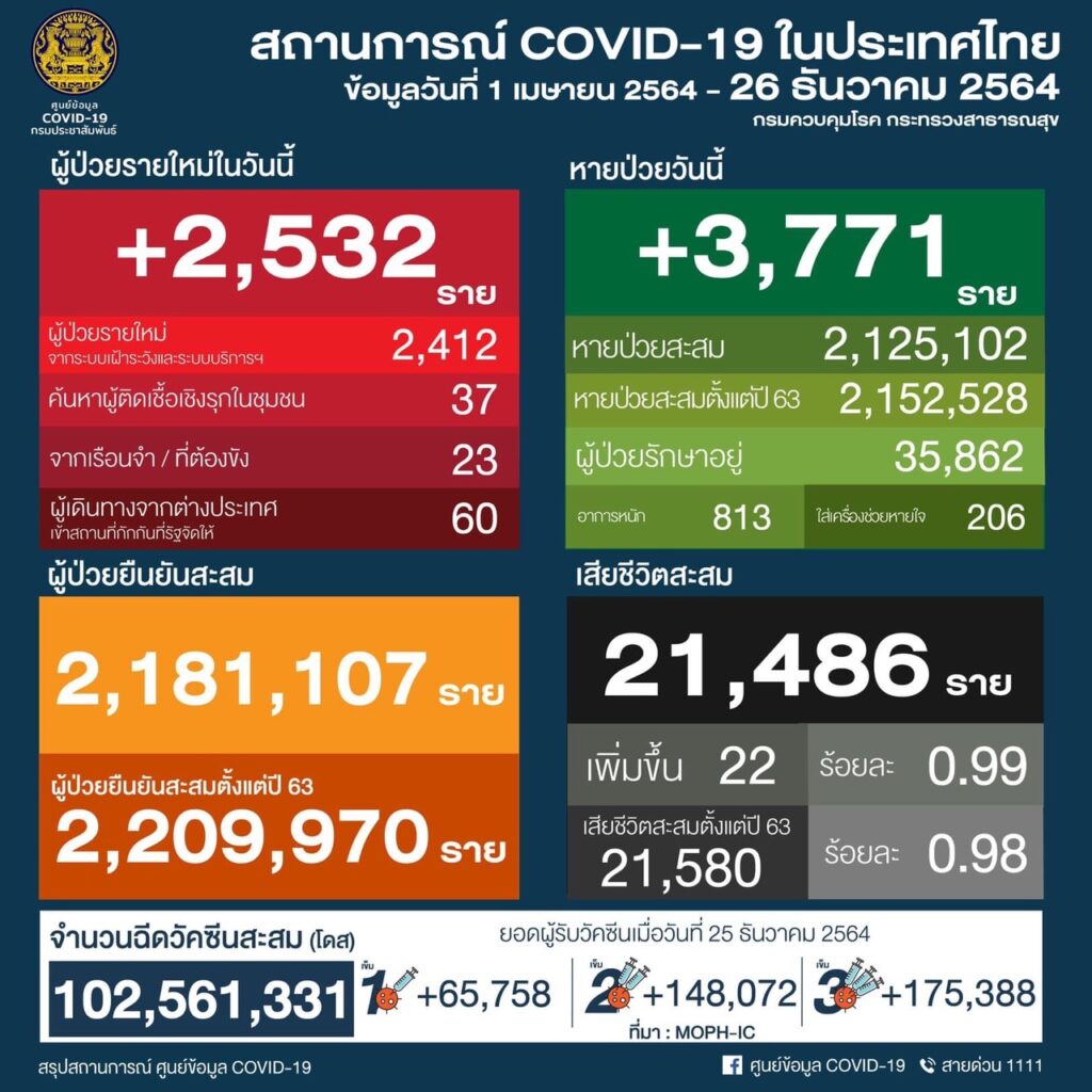 วันที่ 26 ธ.ค.2564 ศูนย์บริหารสถานการณ์โควิด-19 (ศบค.) รายงานสถานการณ์แพร่ระบาดของโควิด-19 ประจำวัน เบื้องต้นมีผู้ป่วยใหม่ 2,532 ราย จำแนกเป็นผู้ป่วยจากระบบเฝ้าระวัง 2,412 ราย ผู้ป่วยจากการค้นหาเชิงรุก 37 ราย ผู้ป่วยภายในเรือนจำ/ที่ต้องขัง 23 ราย ผู้ป่วยมาจากต่างประเทศ 60 ราย ผู้ป่วยสะสม 2,181,107 ราย (ตั้งแต่ 1 เมษายน 2564)