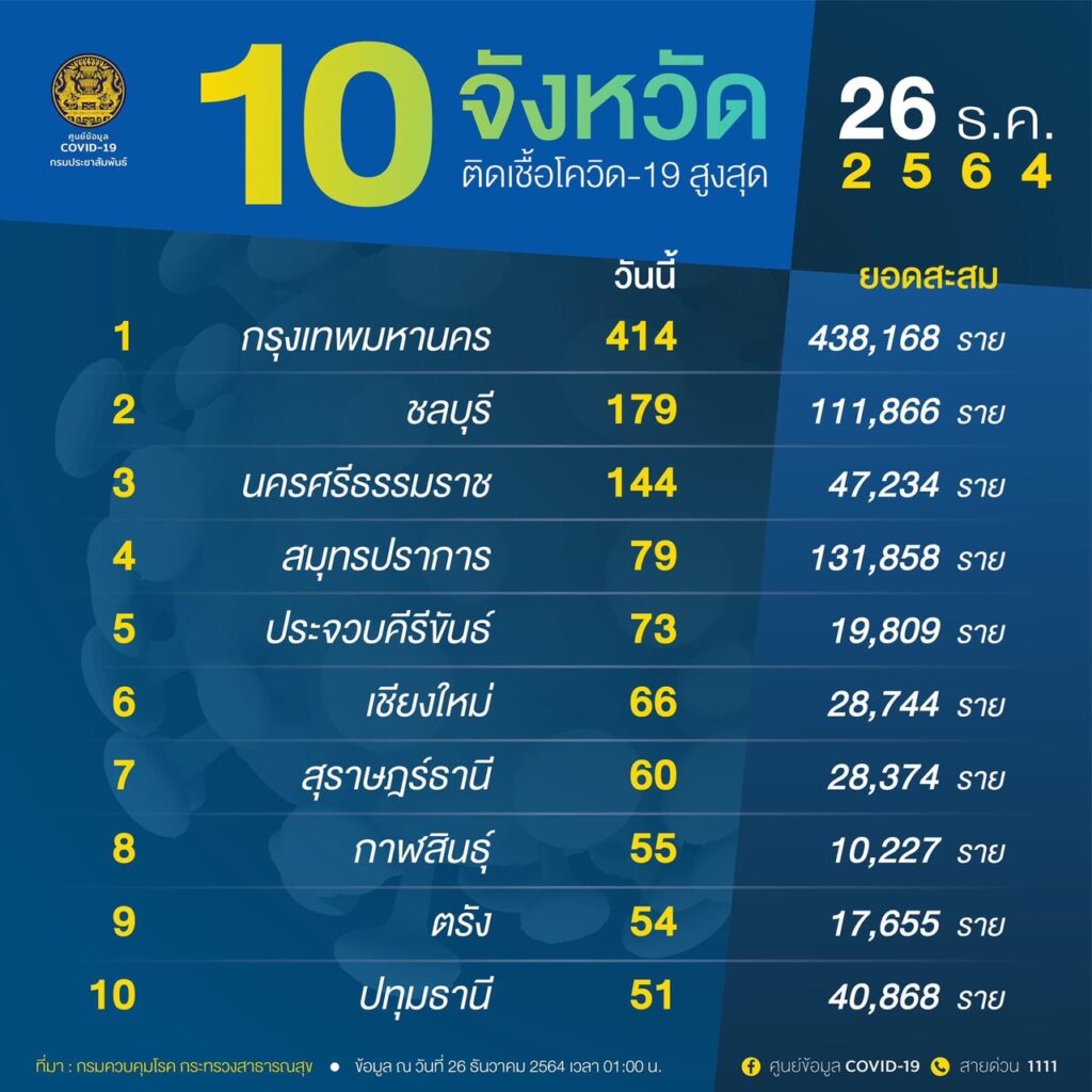 สำหรับ 10 จังหวัดติดเชื้อโควิด-19 สูงสุดได้แก่กรุงเทพมหานคร 414 ราย ชลบุรี 179 ราย นครศรีธรรมราช 144 ราย สมุทรปราการ 79 ราย ประจวบคีรีขันธ์ 73 ราย เชียงใหม่ 66 ราย สุราษฎร์ธานี 60 ราย กาฬสินธุ์ 55 ราย ตรัง 54 ราย และปทุมธานี 51 ราย