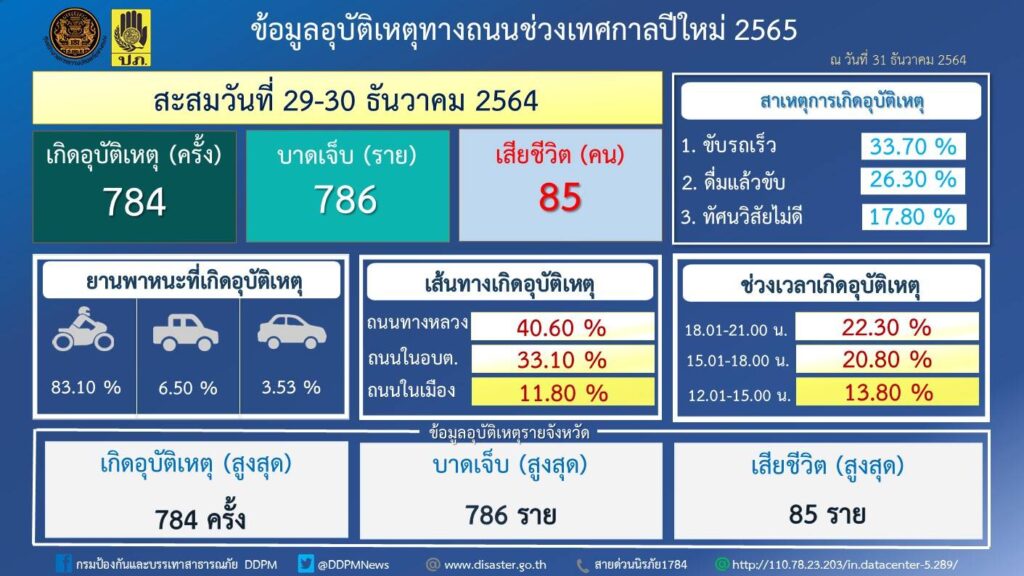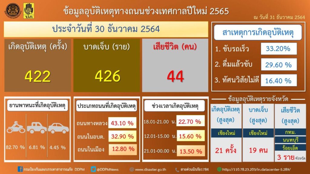 วันนี้ (31 ธ.ค.64) ที่กรมป้องกันและบรรเทาสาธารณภัย ศูนย์อำนวยการป้องกันและลดอุบัติเหตุทางถนนช่วงเทศกาลปีใหม่ พ.ศ.2565 สรุปสถิติอุบัติเหตุทางถนนประจำวันที่ 30 ธันวาคม 2564 เกิดอุบัติเหตุ 422 ครั้ง ผู้เสียชีวิต 44 ราย ผู้บาดเจ็บ 426 คน สรุปอุบัติเหตุทางถนนสะสมในช่วง 2 วันของการรณรงค์ (29-30 ธ.ค. 64) เกิดอุบัติเหตุรวม 784 ครั้ง ผู้เสียชีวิตรวม 85 ราย ผู้บาดเจ็บ รวม 786 คน จังหวัดที่ไม่มีผู้เสียชีวิต (ตายเป็นศูนย์) มี 46 จังหวัด ประสานจังหวัดดูแลความปลอดภัยในการเดินทางของประชาชนถนนทางหลวง เส้นทางสายรอง ถนน อบต.และหมู่บ้าน คุมเข้มขับรถเร็วเกินกว่ากฎหมายกำหนด ดื่มแล้วขับ และไม่สวมหมวกนิรภัย รวมถึงเพิ่มความเข้มข้นจัดตั้งจุดตรวจของด่านชุมชนในเส้นทางสายรอง เส้นทางเข้าออกชุมชนและหมู่บ้าน เพื่อป้องปรามพฤติกรรมเสี่ยงอุบัติเหตุทางถนน รวมถึงขอให้ประชาชนเฉลิมฉลองวันส่งท้ายปีเก่าต้อนรับปีใหม่ โดยปฏิบัติตามมาตรการควบคุมการแพร่ระบาดของโรคโควิด-19 เพื่อให้เทศกาลปีใหม่เต็มเปี่ยมไปด้วยความสุขและความปลอดภัย