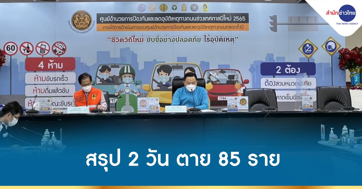 นายนิรัตน์ พงษ์สิทธิถาวร รองปลัดกระทรวงมหาดไทย ในฐานะประธานการประชุมคณะอนุกรรมการเฉพาะกิจศูนย์อำนวยการป้องกันและลดอุบัติเหตุทางถนนตลอดทั้งปี ผ่านสื่ออิเล็กทรอนิกส์ เปิดเผยว่า ศูนย์อำนวยการป้องกันและลดอุบัติเหตุทางถนนช่วงเทศกาลปีใหม่ พ.ศ. 2565 โดยกรมป้องกันและบรรเทาสาธารณภัยและความร่วมมือของหน่วยงานภาคีเครือข่ายได้รวบรวมสถิติอุบัติเหตุทางถนนประจำวันที่ 30 ธันวาคม 2564 ซึ่งเป็นวันที่สองของการรณรงค์ “ชีวิตวิถีใหม่ ขับขี่อย่างปลอดภัย ไร้อุบัติเหตุ” เกิดอุบัติเหตุ 422 ครั้ง ผู้เสียชีวิต 44 ราย ผู้บาดเจ็บ 426 คน สาเหตุที่ทำให้เกิดอุบัติเหตุสูงสุด ได้แก่ ขับรถเร็ว ร้อยละ 33.20 ดื่มแล้วขับ ร้อยละ 29.60 ยานพาหนะที่เกิดอุบัติเหตุสูงสุด ได้แก่ รถจักรยานยนต์ ร้อยละ 82.70 ส่วนใหญ่เกิดบนเส้นทางตรง ร้อยละ 81.80 ถนนกรมทางหลวง ร้อยละ 43.1 ถนนใน อบต./หมู่บ้านร้อยละ 32.9 ช่วงเวลาที่เกิดอุบัติเหตุสูงสุด ได้แก่ ช่วงเวลา 18.01-21.00 น. ร้อยละ 22.70 ผู้บาดเจ็บและเสียชีวิตสูงสุด อยู่ในช่วงอายุ 40 – 49 ปี ร้อยละ 16.10 ทั้งนี้ ได้จัดตั้งจุดตรวจหลัก 1,911 จุด เจ้าหน้าที่ปฏิบัติงาน 62,318 คน เรียกตรวจยานพาหนะ 269,597 คัน มีผู้ถูกดำเนินคดี รวม 46,796 ราย มีความผิดฐานไม่สวมหมวกนิรภัย 14,484 ราย ไม่มีใบขับขี่ 11,866 ราย โดยจังหวัดที่เกิดอุบัติเหตุสูงสุด ได้แก่ เชียงใหม่ (21 ครั้ง) จังหวัดที่มีผู้เสียชีวิตสูงสุด ได้แก่ กรุงเทพมหานคร นนทบุรี ร้อยเอ็ด (จังหวัดละ3 ราย) จังหวัดที่มีผู้บาดเจ็บสูงสุด ได้แก่ เชียงใหม่ (19 คน)