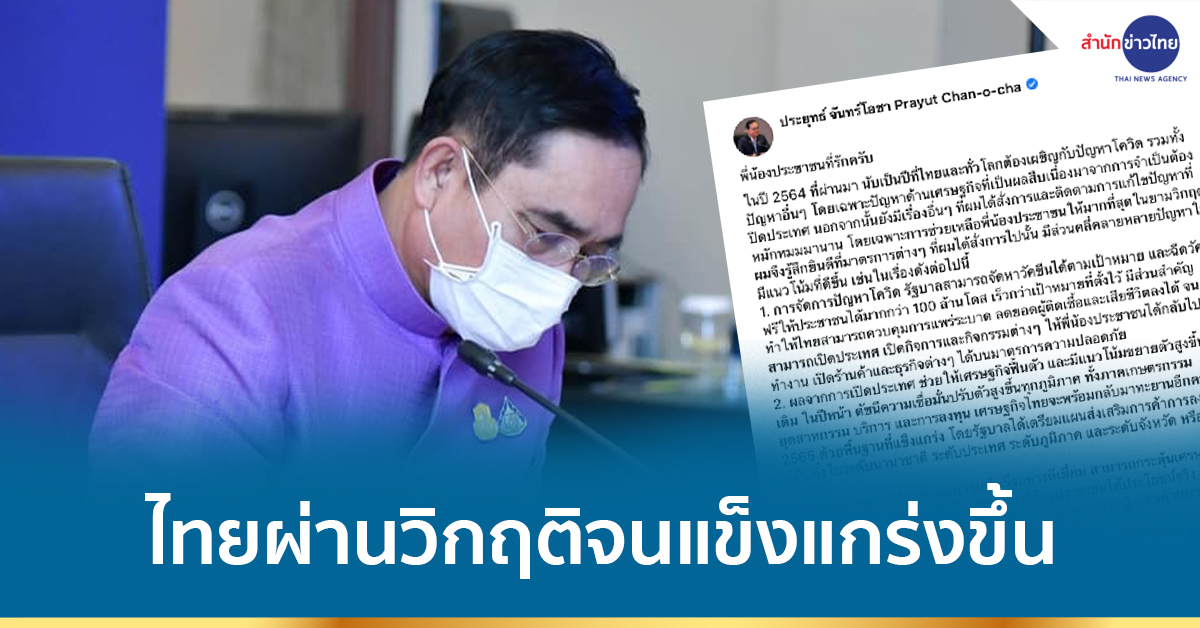 กทม. 2 ม.ค.-นายกฯ โพสต์ข้อความไทยผ่านวิกฤติในปี 2564 มาได้จนแข็งแกร่งขึ้น ชี้ รัฐบาลคลี่คลายปัญหาจากโควิด-19 สามารถเปิดประเทศ ช่วยเศรษฐกิจฟื้นตัว แจงออกมาตรการต่างๆ ช่วยประชาชน เชื่อปี 2565 จะเป็น “ปีแห่งการต่อยอด”