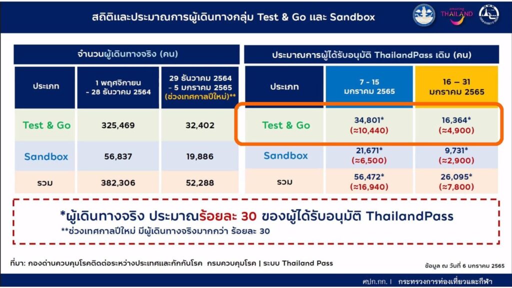 นพ.ทวีศิลป์ วิษณุโยธิน โฆษกศูนย์บริหารสถานการณ์การแพร่ระบาดของโควิด-19 หรือ ศบค. แถลงว่า ที่ประชุม ศบค.เห็นชอบการปรับมาตรการป้องกันควบคุมโรคโควิด-19 สำหรับการเดินทางเข้าราชอาณาจักร โดยกระทรวงการท่องเที่ยวและกีฬา เสนอและพบว่านักท่องเที่ยวที่เข้ามาในระบบTest&Go มีการติดเชื้ออยู่ภายในประเทศพอสมควร จึงมีการชะลอไม่ให้มีการลงทะเบียนเพิ่มเติม โดยในวันที่ 1-15 ม.ค.65 มีผู้ลงทะเบียน 34,801 ราย เข้ามาในประเทศจริง 10,440 ราย และมีการประมาณการว่าในวันที่ 16-31 ม.ค.65 จะเข้ามาอีกประมาณ 4,900 ราย ซึ่งตัวเลขรวมกันในเดือนม.ค. ตกค้างอยู่ที่ประมาณ 15,000 ราย ที่ประชุมจึงเห็นชอบระงับการลงทะเบียนประเภท ระบบ Test&Go ออกไปก่อน สำหรับผู้ได้รับการอนุมัติแล้วและเดินทางเข้ามาภายหลังวันที่ 15 ม.ค.นี้ จะมีการประเมินสถานการณ์และพิจารณาอีกครั้ง เนื่องจากอาจเกิดผลกระทบต่อการท่องเที่ยวและการเดินทางของผู้ที่พำนักในประเทศแล้วเดินทางไปต่างประเทศ ทั้งนี้ ในต่างประเทศก็มีการยกเลิกเที่ยวบินและการเดินทางเช่นเดียวกัน