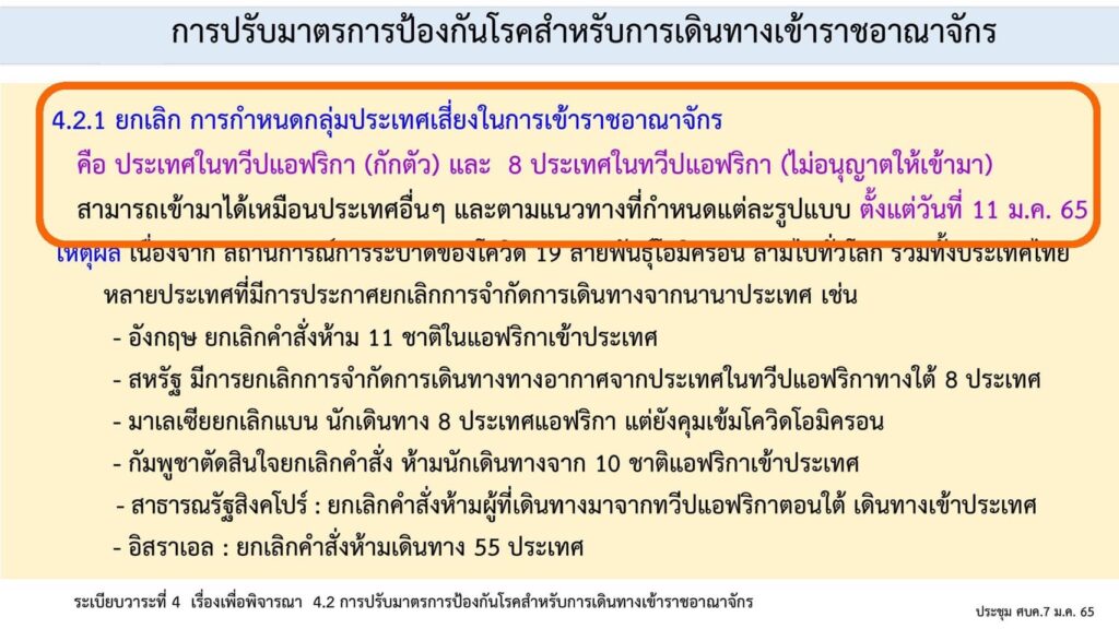 ทำเนียบฯ 7 ม.ค.-ศบค.ยกเลิกห้าม 8 ประเทศทวีปแอฟริกาเข้าไทย หลังติดเชื้อโควิดโอไมครอนทั่วโลก พร้อมระงับลงทะเบียน Test&Go ไม่มีกำหนด เพิ่ม 3 จังหวัดพื้นที่แซนด์บ็อกซ์