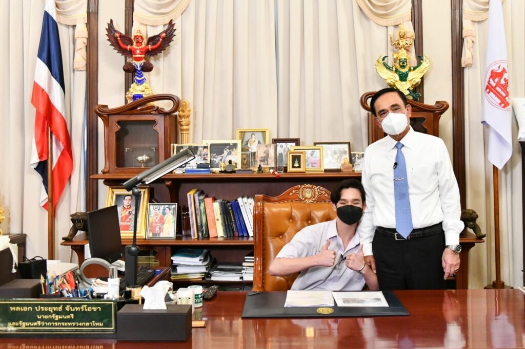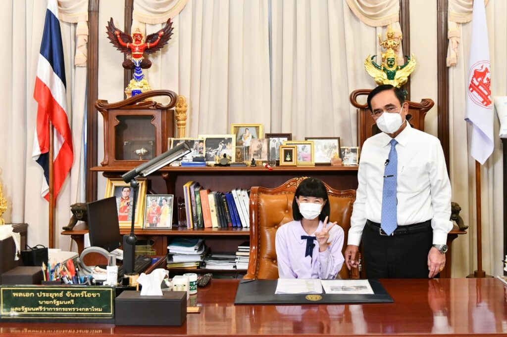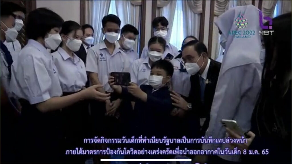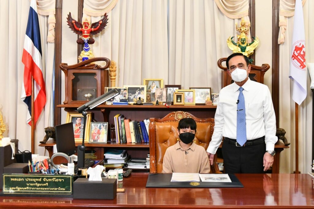 ผู้สื่อข่าวรายงานว่า วันเด็กแห่งชาติประจำปี 2565 ทำเนียบรัฐบาลจัดงานในรูปแบบออนไลน์ และถ่ายทอดสดทางสถานีวิทยุโทรทัศน์แห่งประเทศไทย (NBT) กรมประชาสัมพันธ์ ตั้งแต่เวลา 10.00-12.00 น. ซึ่งในกิจกรรม พล.อ.ประยุทธ์ จันทร์โอชา นายกรัฐมนตรีและรัฐมนตรีว่าการกระทรวงกลาโหม พาตัวแทนเด็กเยาวชน 5 คน นั่งเก้าอี้นายกรัฐมนตรี ที่ตึกไทยคู่ฟ้า ทำเนียบรัฐบาล เพื่อสร้างขวัญกำลังใจ และสร้างแรงบันดาลใจแก่เด็กและเยาวชนในอนาคต พร้อมทั้งได้นั่งพูดคุยกับเด็กเยาวชนถึงความสนใจในด้านต่าง ๆ และความใฝ่ฝันถึงอาชีพที่อยากทำในอนาคต ได้แก่ ด.ญ.เพชร เพชรทอง อยากเป็นนักดนตรีที่มีชื่อเสียง ด.ญ.มลธนัช เผื่อนประเสริฐสุข ที่ชื่นชอบกีฬายิงปืน ด.ญ.ภูวริศา อมาตยกุล อยากเป็นนักธุรกิจ นายปุณณานนท์ ตรีวรรณกุล ที่อยากนำผ้าไทย วัฒนธรรมไทยไปเผยแพร่ให้เป็นสากล นายกรัฐมนตรียังชื่นชมความสามารถในการคิดเลขของ ด.ช.ปองคุณ บุญเกตุ พร้อมอวยพรขอให้เรียนวิชาที่ชอบอย่างสนุก ถือว่าเป็นสิ่งที่ดี และขอให้ทุกคนมีความฝัน มีความตั้งใจในสิ่งที่อยากทำ ตั้งเป้าอนาคตของตนเอง ค้นหาสิ่งที่ตนเองชอบเพราะอาจมีหลากหลายด้าน ขอให้มีความกตัญญูรู้คุณต่อบิดา มารดา เพื่อที่ได้เป็นหนึ่งในพลังการขับเคลื่อนประเทศไทยไปข้างหน้าด้วยกัน