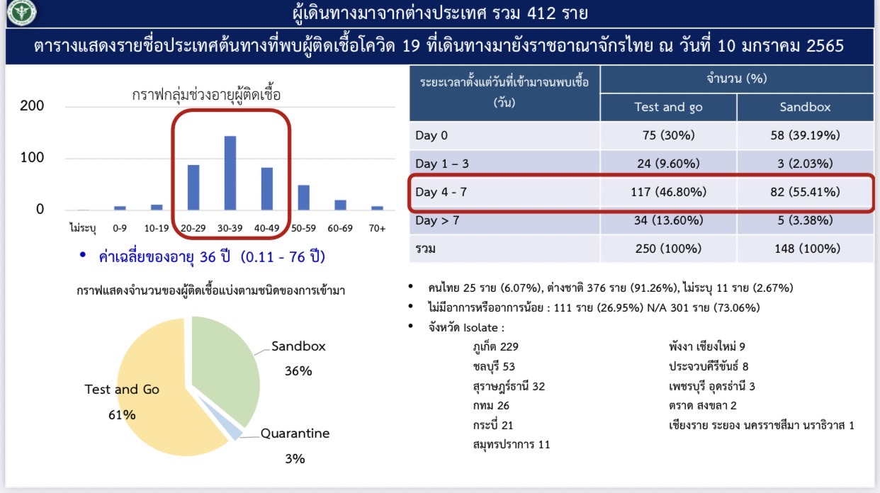 สำหรับผู้ป่วยที่เดินทางมาจากต่างประเทศ จำนวน 412 ราย เป็นคนไทย 25 ราย ต่างชาติ 376 ราย ไม่ระบุ 11 ราย พบว่าไม่มีอาการ 111 ราย อาการน้อย 301 ราย โดยแบ่งเป็นการเข้ามาในระบบTest and Go 61% sandbox 36% Quarantine 3%