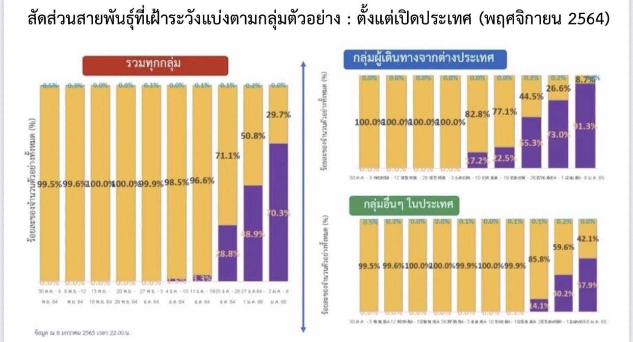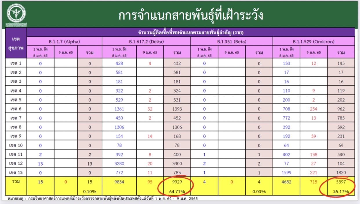 พญ.สุมนี กล่าวถึงความคืบหน้าการติดตามผู้ป่วยสายพันธุ์โอไมครอนในประเทศไทยว่า ขณะนี้ประเทศไทยพบผู้ป่วยสายพันธุ์โอไมครอนรวม 5,397 ราย คิดเป็น 35.17% สายพันธุ์เดลต้า 9,929 ราย คิดเป็น 64.71% ส่วนใหญ่ผู้ติดเชื้อสายพันธุ์โอไมครอนจะไม่มีอาการ จึงจำเป็นที่ประชาชนจะต้องปฏิบัติตัวตามมาตรการป้องกันส่วนบุคคลอย่างเข้มงวด ไม่เข้าไปในสถานที่เสี่ยง และตรวจคัดกรองด้วยชุดตรวจ ATK เมื่อมีความเสี่ยง และสังเกตอาการแยกกักตัวตามมาตรการ