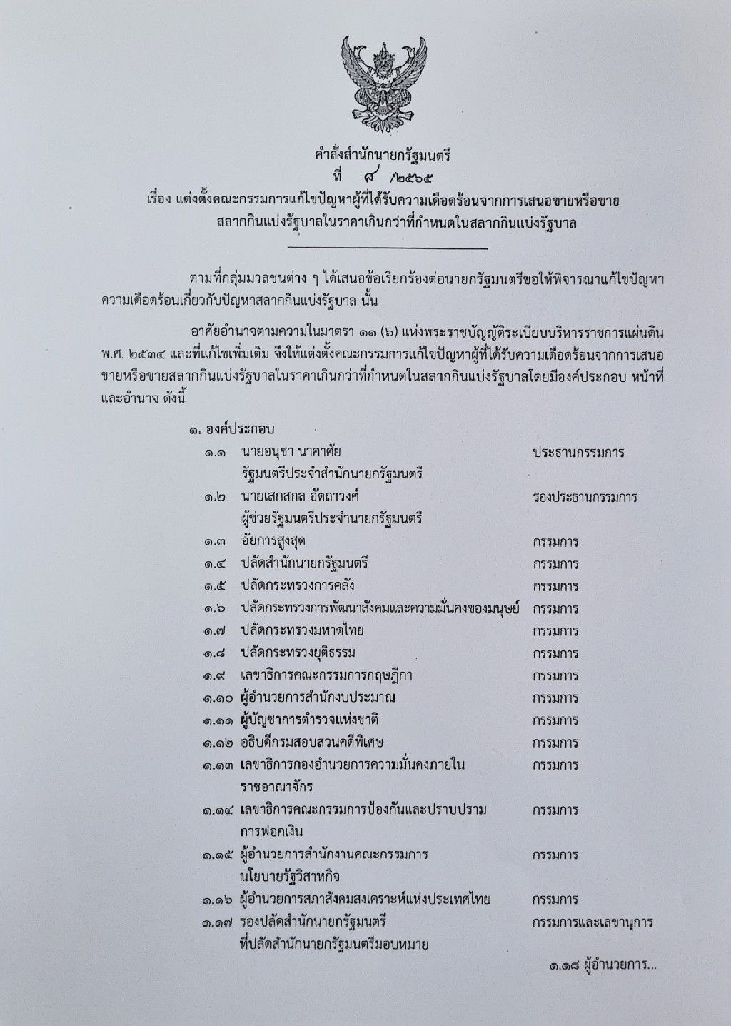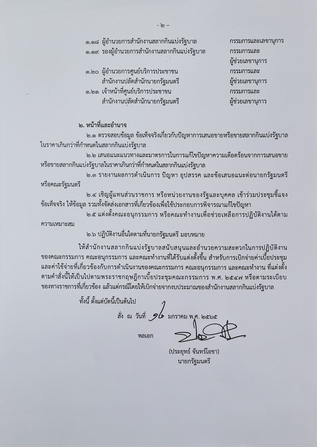 พล.อ.ประยุทธ์ จันทร์โอชา นายกรัฐมนตรีและรัฐมนตรีว่าการกระทรวงกลาโหม ลงนามคำสั่งสำนักนายกรัฐมนตรี ที่ 8/2565 ลงวันที่ 12 ม.ค. 65 เรื่องแต่งตั้งคณะกรรมการแก้ไขปัญหาผู้ที่ได้รับความเดือดร้อนจากการเสนอขายหรือขายสลากกินแบ่งรัฐบาลในราคาเกินกว่าที่กำหนดในสลากกินแบ่งรัฐบาล โดยมีเนื้อหาระบุว่า ตามที่กลุ่มมวลชนต่าง ๆ เสนอข้อเรียกร้องต่อนายกรัฐมนตรี ขอให้พิจารณาแก้ไขปัญหาความเดือดร้อนเกี่ยวกับปัญหาสลากกินแบ่งรัฐบาลนั้น อาศัยอำนาจตามความมาตรา 11 (6)แห่งพระราชบัญญัติระเบียบบริหารราชการแผ่นดินปี 2534 และที่แก้ไขเพิ่มเติม