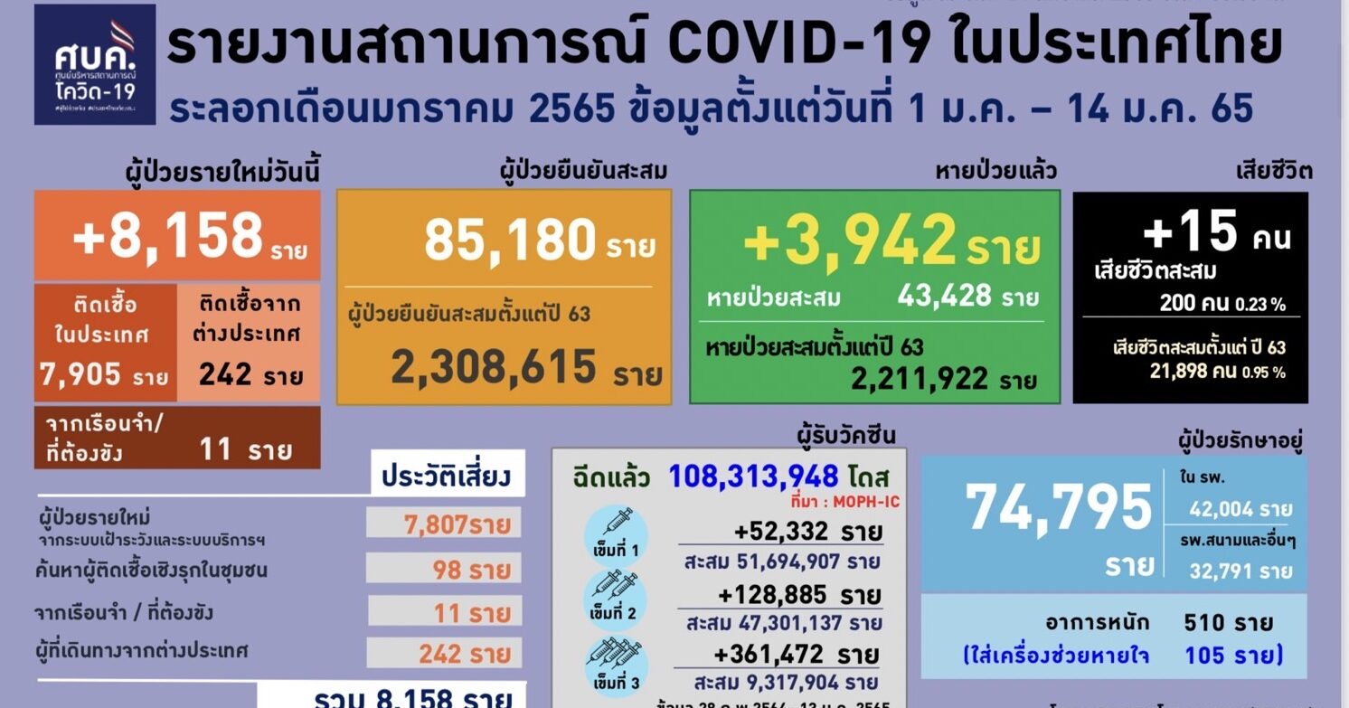 ทำเนียบ 14 ม.ค.-ศบค.พบผู้ติดเชื้อโควิดรายใหม่ 8,158 ราย หากรวมผลตรวจ ATK ยอดอยู่ที่ 10,877 ราย แต่ยังอยู่ในตัวเลขประมาณการ ยังพบครัสเตอร์ร้ายอาหาร งานบุญ และโรงงาน มีปัจจัยเสี่ยงจากการรับประทานอาหารร่วมกัน เดินทางข้ามจังหวัด ย้ำยังคงเข้มนักท่องเที่ยวเข้าประเทศ หลัง 15 ม.ค.ยังมาได้สำหรับผู้ลงทะเบียนไว้แล้ว