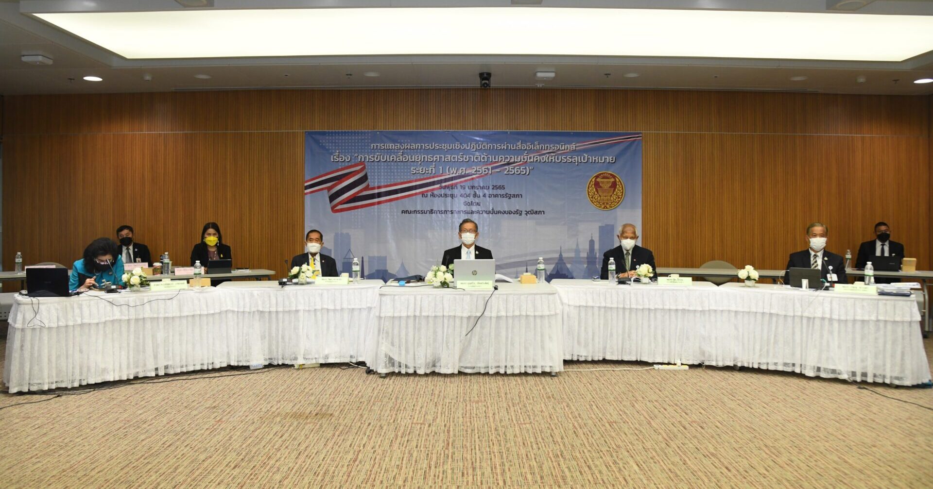พล.อ.บุญสร้าง เนียมประดิษฐ์ ประธานคณะกรรมาธิการการทหารและความมั่นคงของรัฐ วุฒิสภา แถลงผลการประชุมเชิงปฏิบัติการผ่านสื่ออิเล็กทรอนิกส์เรื่องการขับเคลื่อนยุทธศาสตร์ชาติด้านความมั่นคงให้บรรลุเป้าหมาย ระยะที่ 1(พ.ศ.2561- 2565)โดยมีพล.อ.วรพงษ์ สง่าเนตร พล.อ.จีระศักดิ์ ชมประสพ รองประธานคณะกรรมาธิการ นางดิสดารก์ เวชยานนท์ โฆษกคณะกรรมาธิการฯ พ.อ.นิธินันท์ ฤทธิ์ชัยทิพย์ ผู้อำนวยการส่วนความมั่นคงพิเศษ พล.ต.สุรพงษ์ อยู่พร้อม รองผู้อำนวยการสำนักนโยบายและยุทธศาสตร์ความมั่นคง พ.ท.วีรศรุต์ ประดิษฐสุวรรณ ผอ.กองนโยบายและแผน สำนักข่าวกรอง กอ.รมน. เข้าร่วมประชุม ซึ่งปี 2565 เป็นปีสุดท้ายของการดำเนินการตามยุทธศาสตร์ชาติในช่วง 5 ปีแรกที่ต้องมีผลสัมฤทธิ์ที่ชัดเจนจับต้องได้ตามที่ระบุไว้ในยุทธศาสตร์ชาติ