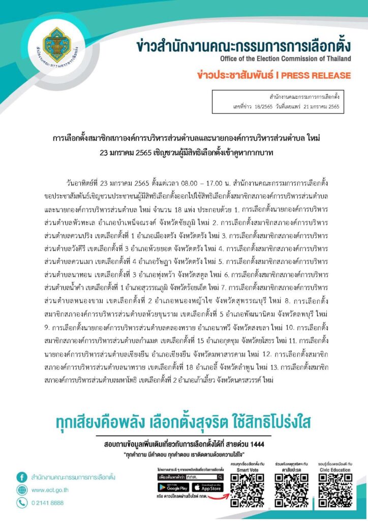 กกต. วันนี้ (21 ม.ค.) สำนักงาน กกต.เชิญชวนประชาชนผู้มีสิทธิเลือกตั้งออกไปใช้สิทธิเลือกตั้งนายกและสมาชิกสภาองค์การบริหารส่วนตำบลใหม่ จำนวน 18 แห่ง ในวันอาทิตย์ที่ 23 มกราคมนี้ ตั้งแต่เวลา 08.00-17.00 น. โดยทั้ง 18 แห่งประกอบด้วย การเลือกตั้งนายก อบต.หัวทะเล อ.บำเหน็จณรงค์ จ.ชัยภูมิ การเลือกตั้งสมาชิกสภา อบต.ควนปริง เขตเลือกตั้งที่ 1 อ.เมืองตรัง จ.ตรัง การเลือกตั้งสมาชิกสภา อบต.วังคีรี เขตเลือกตั้งที่ 3 อ.ห้วยยอด จ.ตรัง ใหม่ การเลือกตั้งสมาชิกสภาอบต.ควนเมา เขตเลือกตั้งที่ 4 อ.รัษฎา จ.ตรัง การเลือกตั้งสมาชิกสภาอบต.นาทอน เขตเลือกตั้งที่ 3 อ.ทุ่งหว้า จ.สตูล การเลือกตั้งสมาชิกสภาอบต.น้ำคำ เขตเลือกตั้งที่ 1 อ.สุวรรณภูมิ จ.ร้อยเอ็ด การเลือกตั้งสมาชิกสภาอบต.หนองขาม เขตเลือกตั้งที่ 2 อ.หนองหญ้าไซ จ.สุพรรณบุรี การเลือกตั้งสมาชิกสภาอบต.ห้วยขุนราม เขตเลือกตั้งที่ 5 อ.พัฒนานิคม จ.ลพบุรี การเลือกตั้งนายกอบต.คลองทราย อ.นาทวี จ.สงขลา