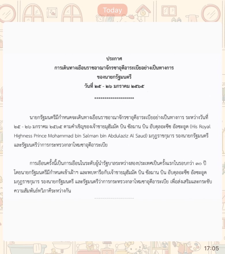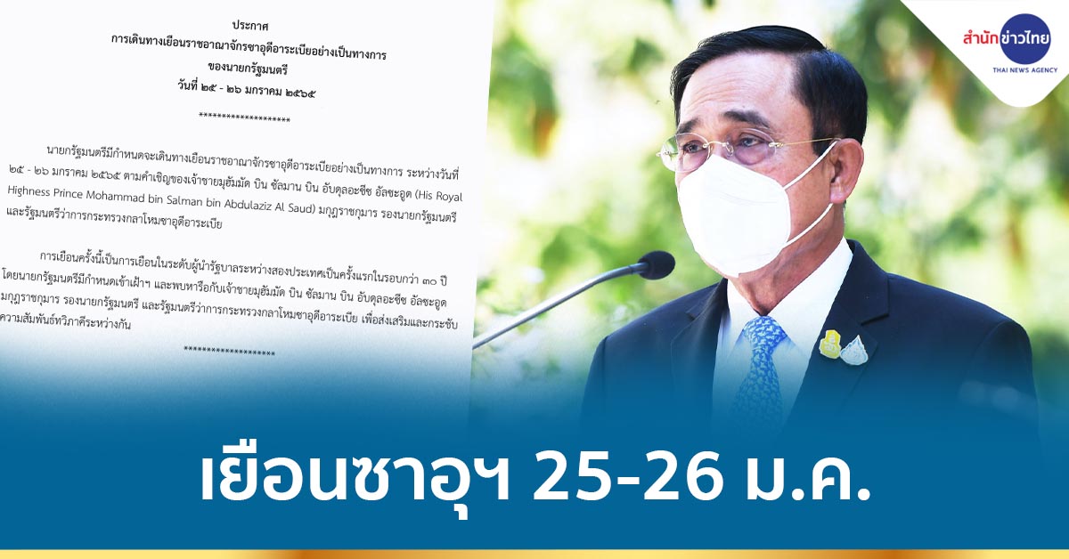 พลเอก ประยุทธ์ จันทร์โอชา นายกรัฐมนตรีมีกำหนดจะเดินทางเยือนราชอาณาจักรซาอุดีอาระเบียอย่างเป็นทางการ ระหว่างวันที่ 25-26 มกราคม 2565 ตามคำเชิญของเจ้าชายมุฮัมมัด บิน ซัลมาน บิน อับดุลอะซีซ อัลซะอูด (His Royal Highness Prince Mohammad bin Salman bin Abdulaziz Al Saud) มกุฎราชกุมาร รองนายกรัฐมนตรีและรัฐมนตรีว่าการกระทรวงกลาโหมซาอุดีอาระเบีย