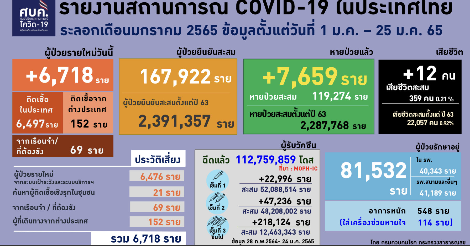 พญ.สุมนี วัชรสินธุ์ ผู้ช่วยโฆษกศูนย์บริหารสถานการณ์การแพร่ระบาดของโรคติดเชื้อไวรัสโคโรนา 2019 หรือ ศบค. แถลงยอดผู้ติดเชื้อโควิดรายใหม่วันนี้ 6,718 ราย ติดเชื้อในประเทศ 6,497 ราย ติดเชื้อจากต่างประเทศ 152 ราย จากเรือนจำ ที่ต้องขัง 69 ราย โดยมีผู้ป่วยหายแล้ว 7,659 ราย ผู้ป่วยรักษาอยู่ 81,532 ราย ผู้ป่วยรักษาตัวอยู่ในโรงพยาบาล 40,343 ราย ผู้ป่วยรักษาอยู่ในโรงพยาบาลสนามและอื่นๆ 41,189 ราย ผู้ป่วยอาการหนัก 548 ราย ผู้ป่วยใส่เครื่องช่วยหายใจ 114 ราย และมีผู้เสียชีวิต 12 คน