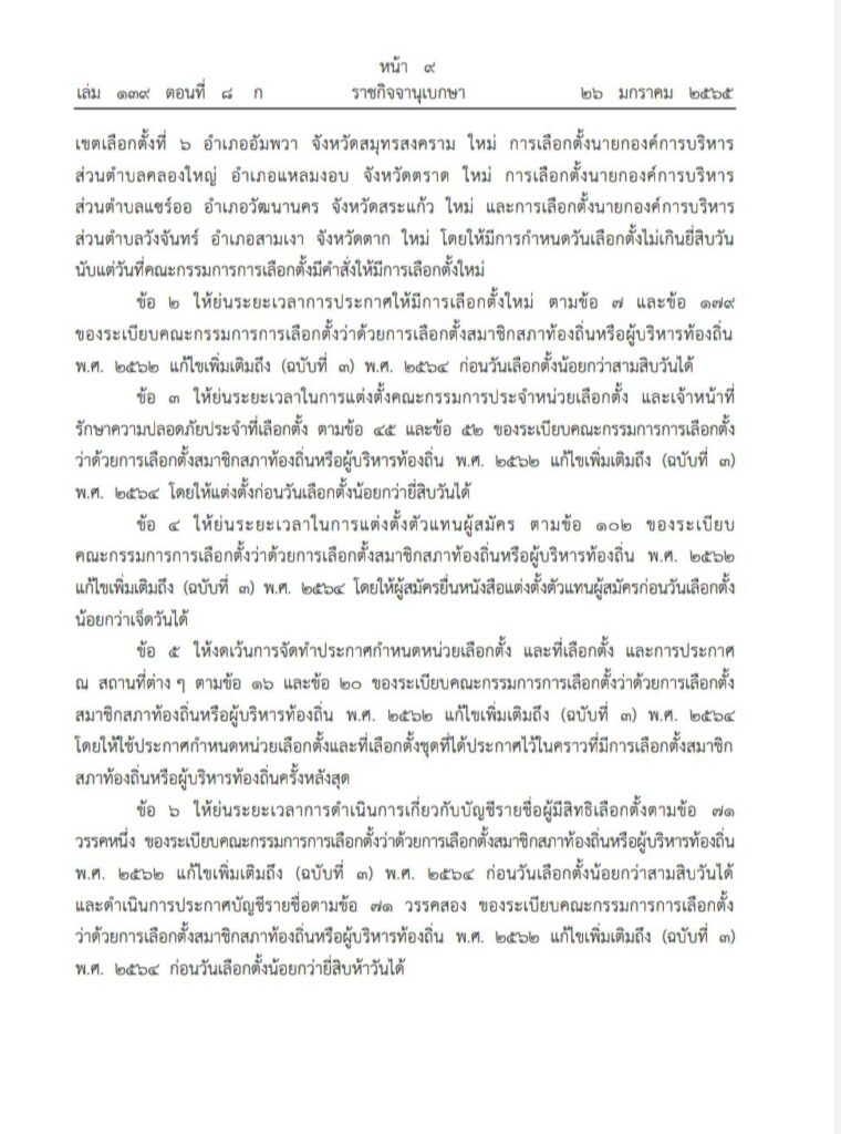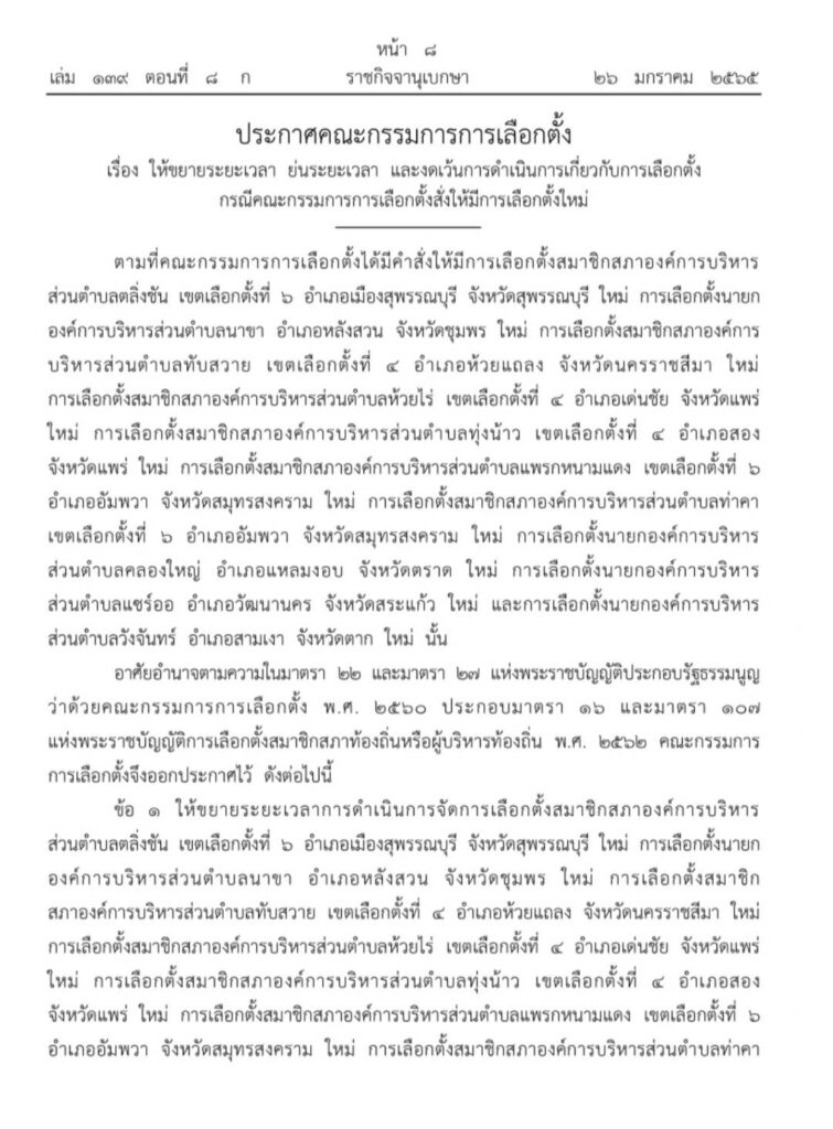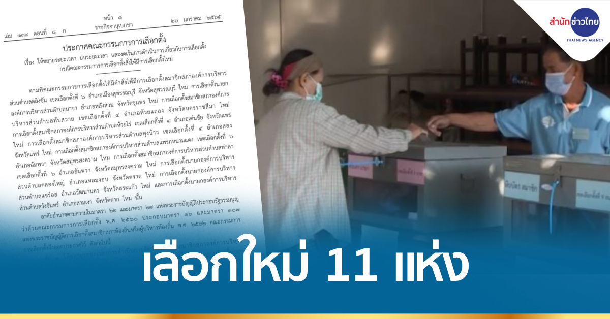 เว็บไซต์ราชกิจจานุเบกษา ได้เผยแพร่คำสั่งคณะกรรมการการเลือกตั้งให้มีการเลือกตั้งสมาชิกสภาองค์การบริหารส่วนตําบล (ส.อบต.) และนายกองค์การบริหารส่วนตําบล (นายก อบต.) ใหม่ รวม 11 แห่ง ใน 9 จังหวัด ประกอบด้วย