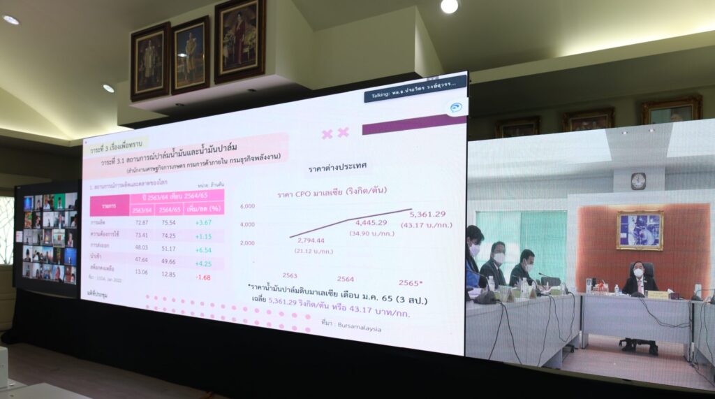 พล.ต.อ.ดร.ธรรมศักดิ์ วิชชารยะ รองเลขาธิการนายกรัฐมนตรี กล่าวว่า ณ ม.ค.65 ราคาปาล์มทะลายเฉลี่ย กก. 10.49 บาท ราคาน้ำมันปาล์มดิบเฉลี่ย กก.ละ 54.27 บาท ส่วนราคาตลาดมาเลเซีย ตันละ 5,628 ริงกิต หรือ คิดเป็น กก. ละ 45.31 บาท โดยมีสต๊อก ณ สิ้นเดือน ม.ค.นี้ อยู่ที่ 1.31 แสนตัน หากปี 65 ผลผลิตสูงขึ้นตามคาดการณ์ของ สศก. ขณะเดียวกันความต้องการใช้ภายในประเทศมีแนวโน้มลดลงจากสัดส่วนของไบโอดีเซล จำเป็นต้องอาศัยการส่งออกให้ได้ 5 แสนตัน เพื่อดูดซับสต็อกส่วนเกินที่จะเพิ่มขึ้นอย่างรวดเร็วในช่วงไตรมาส 2 ซึ่งแสดงให้เห็นว่า มาตรการต่างๆ ที่ กนป. เห็นชอบในครั้งนี้ยังคงเป็นกลไกสำคัญที่ต้องดำเนินการไปพร้อมๆ กันอย่างต่อเนื่อง โดยเฉพาะมาตรการเพิ่มมูลค่า 8 ผลิตภัณฑ์เป้าหมาย ซึ่งจะเป็นทางออกที่ยั่งยืนในอนาคต คาดว่านโยบายและมาตรการของ พล.อ.ประวิตร ประธาน กนป. รวมทั้ง การบริหารจัดการเชิงบูรณาการของหน่วยงานที่เกี่ยวข้องทุกฝ่าย โดยเฉพาะกระทรวงเกษตรและสหกรณ์ กระทรวงพาณิชย์ กระทรวงอุตสาหกรรม และกระทรวงพลังงาน จะส่งผลให้ราคาปาล์มทะลายโดยเฉลี่ยทั้งปี 65 อยู่ที่ กก.ละ 6-8 บาท สูงกว่าต้นทุนที่แท้จริง (กก.ละ 3.50 – 4.0 บาท) ของเกษตรกรชาวสวนปาล์ม รวมทั้ง ผลิตภัณฑ์ปาล์มน้ำมันทุกชนิด น้ำมันปาล์มดิบ น้ำมันปาล์มบริสุทธิ์บรรจุขวด ไบโอดีเซล (บี 100) อยู่ในระดับราคาที่เหมาะสมและเป็นธรรมกับทุกฝ่าย สำหรับผู้บริโภค พลังงานทดแทน และส่งออก เพื่อผลักดันให้ปาล์มน้ำมันคงความเป็นพืชเศรษฐกิจที่มีอนาคตของไทยอย่างมีเสถียรภาพและยั่งยืน ตามนโยบายของรัฐบาลต่อไป