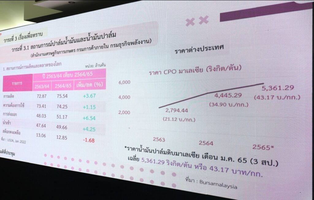 ทั้งนี้ จากรายงานของสำนักงานเศรษฐกิจการเกษตร (สศก.) ระบุว่า ปี 2564 ไทยมีผลผลิตปาล์มน้ำมัน 16.79 ล้านตัน คิดเป็นผลผลิตในรูปน้ำมันปาล์มดิบ ประมาณ 3.17 ล้านตัน ในขณะที่มีความต้องการใช้ 3.00 ล้านตัน (การใช้ในประเทศ 2.38 ล้านตัน และการส่งออก 0.62 ล้านตัน) ทำให้ ณ สิ้นปี 2564 มีสต็อกน้ำมันปาล์มดิบ 0.17 ล้านตัน ส่งผลทำให้ราคาปาล์มน้ำมันและน้ำมันปาล์มปรับตัวเพิ่มขึ้น