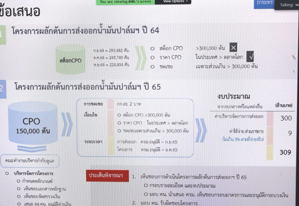 - โครงการผลักดันการส่งออกน้ำมันปาล์มเพื่อลดผลผลิตส่วนเกิน ปี 2565 โดยจะสนับสนุนค่าใช้จ่ายในการบริหารจัดการสำหรับการส่งออกเฉพาะน้ำมันปาล์มดิบ (Crude Palm Oil : CPO) ในอัตรา ไม่เกิน 2.00 บาทต่อกิโลกรัม เมื่อระดับสต็อกน้ำมันปาล์มดิบในประเทศสูงกว่า 300,000 ตัน และราคาน้ำมันปาล์มดิบในประเทศสูงกว่าราคาตลาดโลก