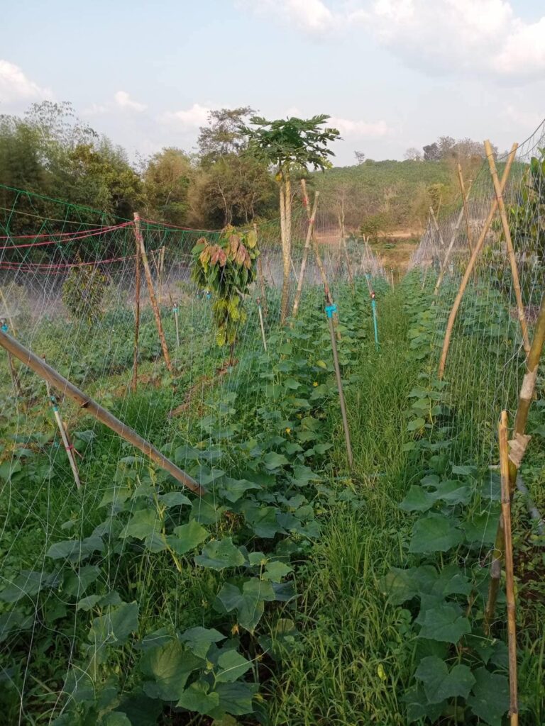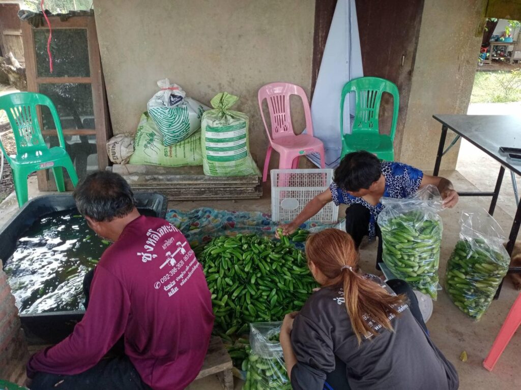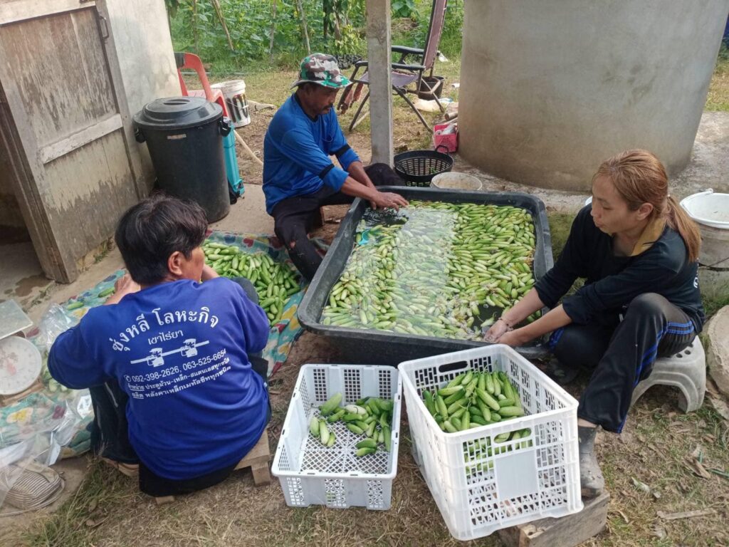 “สรศักดิ์ บุญอำไพ” สมาชิกวิสาหกิจชุมชนเกษตรกรรุ่นใหม่พัฒนา กล่าวว่า สมาชิกเราทุกคนตั้งใจใช้พื้นที่ทุกตารางเมตรให้คุ่มค่า ปลูกไม้ยืนต้น สัก พยูง ไม้ใช้สอย มะม่วง ทุเรียน ลองกอง มังคุด ผักพื้นบ้านต่างๆ ไว้บริโภค อย่างครอบครัวผมมีรายได้จากแตงกวาแล้ว ปลูกในเนื้อที่ประมาณ 3 งาน เก็บผลผลิตได้ทุกวัน วันนี้เป็นวันที่สิบของรอบใหม่แล้ว ราคาแตงกวา กิโลละ 32 บาท แตงกวางอ่อน กิโลละ 16 บาท วันหนึ่งเก็บได้ประมาณ 60 กิโลกรัม ช่วงที่ออกลูกจากวันแรกเก็บได้ประมาณ 30-40 วัน แล้วแต่การดูแล ตอนนี้ก็เตรียมแปลงสำหรับปลูกชุดถัดไปอีกสัก 1 อาทิตย์ จะลงเมล็ดพันธุ์ของชุดใหม่ ขอบคุณ บจธ. จริงๆ คนรายได้น้อยอย่างเรา โอกาสยากมากที่จะได้ที่ดินเป็นของตนเองแบบนี้ เราสัญญาว่าจะทำให้ดีที่สุด
