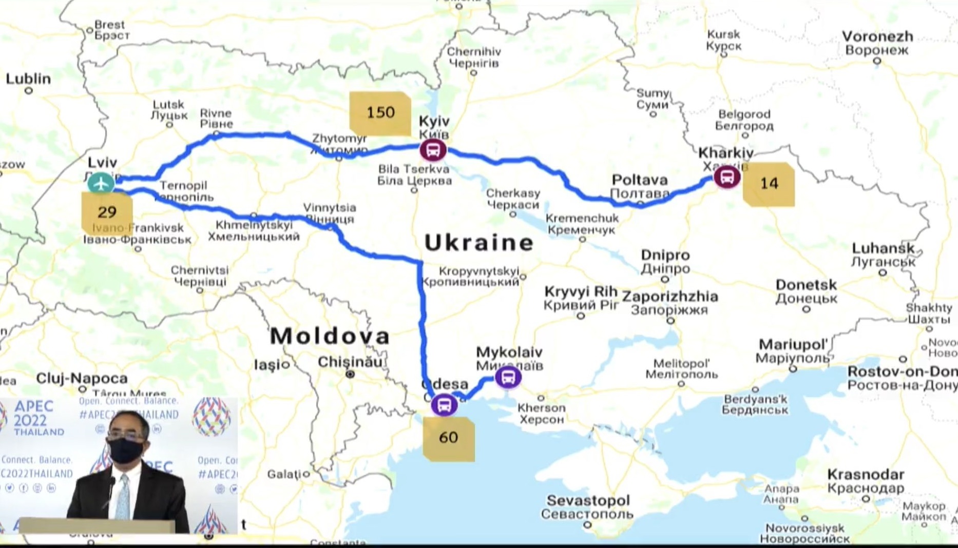 “สถานเอกอัครราชทูตฯ ได้ประสานเจ้าของร้านที่มีลูกจ้างคนไทย วางแผนนำคนไทยจากเมืองต่าง ๆ มายังเมือง Lviv หรือหากจำเป็น สถานเอกอัครราชทูตฯ จะจัดหารถบัส รถตู้จากโปแลนด์ ยูเครนไปรับคนไทยมายังเมือง Lviv ซึ่งเมือง Lviv อยู่ห่างจากรุงเคียฟประมาณ 540 กม. ใช้เวลาเดินทาง 8-9 ชม. และอยู่ห่างจากเมือง Odesa เกือบ 800 กม. ใช้เวลาเดินทาง 11-14 ชั่วโมง ขณะที่แผนอพยพที่ 2 จะเช่าเหมาลำจากกรุงวอร์ซอ – กรณีที่น่านฟ้าในยูเครนปิดและ หรือเมือง Lviv มีสถานการณ์ความรุนแรง โดยสถานเอกอัครราชทูตฯ จะจัดรถบัส รถตู้นำคนไทยในยูเครนข้ามแดนมายังกรุงวอร์ซอ เพื่อขึ้นเครื่องบินเช่าเหมาลำกลับไทยต่อไป ซึ่งเมือง Lviv อยู่ห่างจากกรุงวอร์ซอประมาณ 400 กม. (ใช้เวลาเดินทาง 6-7 ชม.) โดยต้องมีขั้นตอนการผ่านแดนด้วยประมาณ 1-2 ชม.