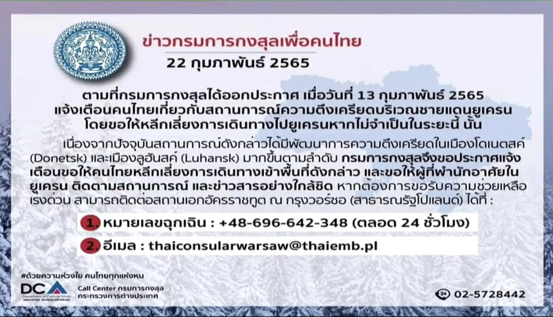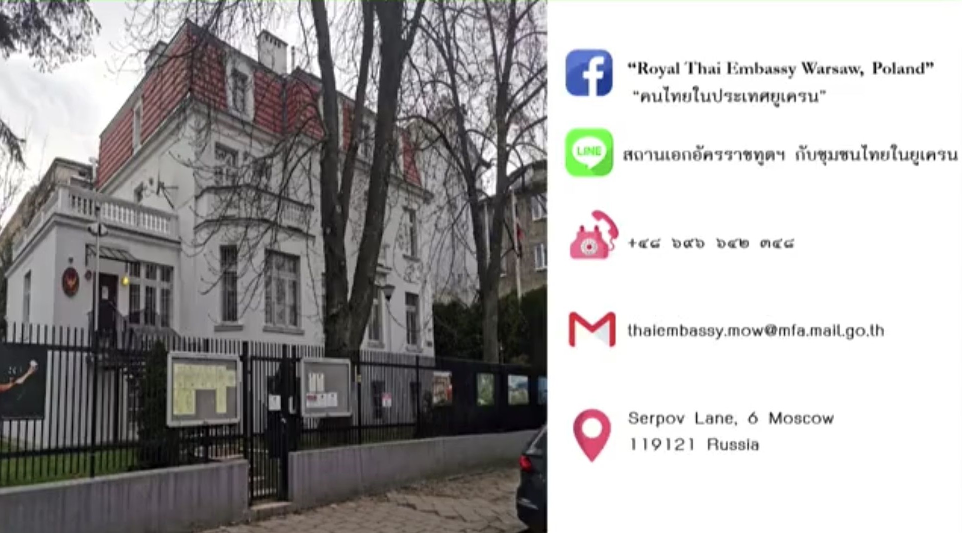 “ขอเน้นย้ำช่องทางการประสานงานเพื่อแจ้งข่าวสารและดูแลความปลอดภัยของคนไทยในยูเครน ดังนี้ Facebook สถานเอกอัครราชทูตฯ “Royal Thai Embassy, Warsaw, Poland” และ Facebook กลุ่ม “คนไทยในประเทศยูเครน” กลุ่ม LINE ระหว่างสถานเอกอัครราชทูตฯ กับชุมชนไทยในยูเครนเพื่อสื่อสารกับคนไทยได้อย่างรวดเร็วและทันเหตุการณ์ยิ่งขึ้น กลุ่ม Telegram ระหว่างสถานเอกอัครราชทูตฯ กับเจ้าของร้านสปาไทย ชาวยูเครน (Telegram เป็น Chat application ซึ่งคนยูเครนนิยมใช้) เพื่อการประสานงานอย่างทันท่วงทีกรณีมีเหตุการณ์ฉุกเฉินด้วย และหมายเลข Hotline (+48696642348) สามารถติดต่อได้ 24 ชม.และอีเมล์ติดต่อได้ที่ thaiconsularwarsaw@thaiemb.pl.-สำนักข่าวไทย