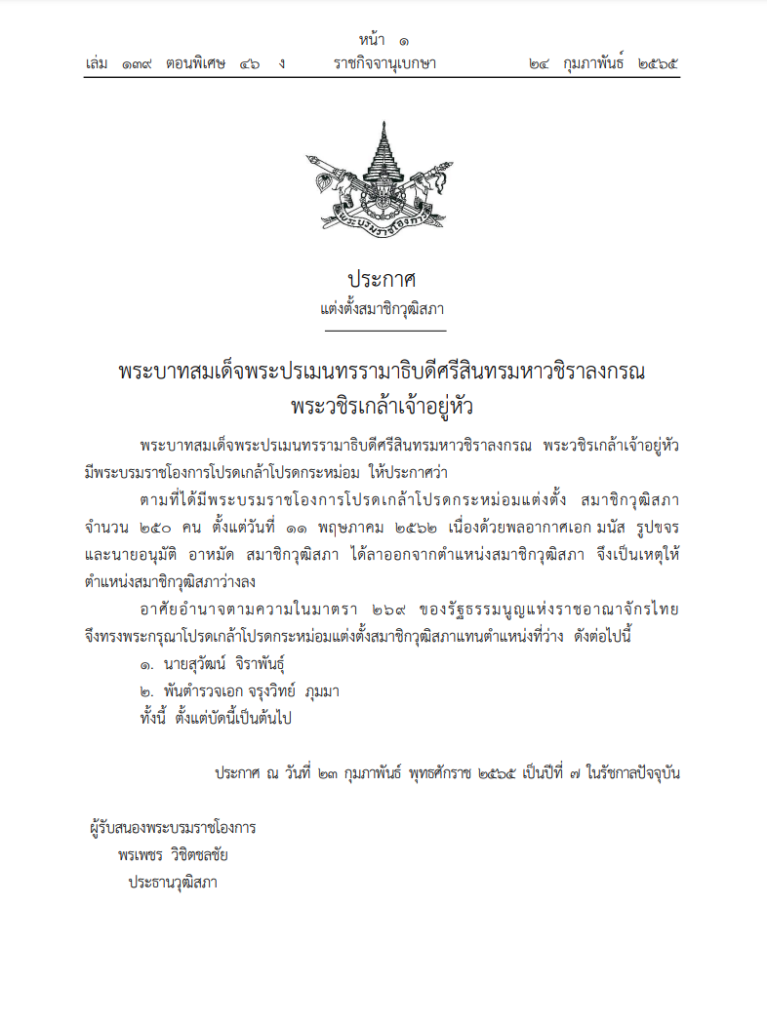 ราชกิจจานุเบกษา เผยแพร่พระบรมราชโองการโปรดเกล้าโปรดกระหม่อม แต่งตั้ง สมาชิกวุฒิสภาแทนตำแหน่งที่ว่าง เนื่องด้วย พล.อ.อ.มนัส รูปขจร และนายอนุมัติ อาหมัด สมาชิกวุฒิสภา ได้ลาออกจากตำแหน่งสมาชิกวุฒิสภา จึงเป็นเหตุให้ตำแหน่งสมาชิกวุฒิสภาว่างลง อาศัยอำนาจตามความในมาตรา 269 ของรัฐธรรมนูญแห่งราชอาณาจักรไทย จึงทรงพระกรุณาโปรดเกล้าโปรดกระหม่อมแต่งตั้งสมาชิกวุฒิสภาแทนตำแหน่งที่ว่าง คือ นายสุวัฒน์ จิราพันธุ์ และพ.ต.อ.จรุงวิทย์ ภุมมา ตั้งแต่บัดนี้เป็นต้นไป ประกาศ ณ วันที่ 23 กุมภาพันธ์ 2565 ผู้รับสนองพระบรมราชโองการ พรเพชร วิชิตชลชัย ประธานวุฒิสภา .-สำนักข่าวไทย
