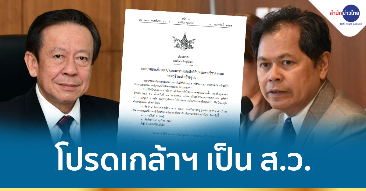กทม. 24 ก.พ.-ราชกิจจานุเบกษา เผยแพร่พระบรมราชโองการโปรดเกล้าโปรดกระหม่อม แต่งตั้ง “สุวัฒน์-พ.ต.อ.จรุงวิทย์” เป็น ส.ว.แทนตำแหน่งที่ว่าง