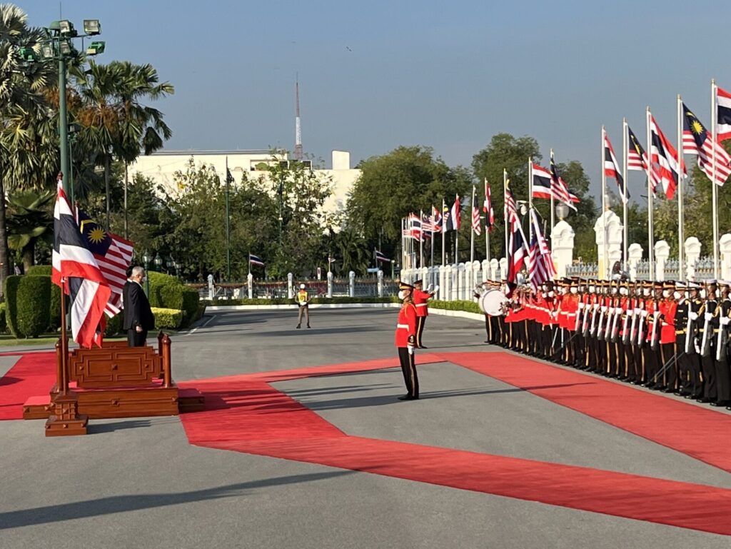 นายกรัฐมนตรี ได้นำนายกรัฐมนตรีมาเลเซีย ตรวจแถวกองทหารเกียรติยศ ที่สนามหญ้าหน้าตึกไทยคู่ฟ้า ก่อนที่จะลงนามในสมุดเยี่ยมและชมของที่ระลึก จากนั้นจะเป็นการหารือข้อราชการระหว่างนายกรัฐมนตรี กับนายกรัฐมนตรีมาเลเซีย ในเรื่องแนวทางการขับเคลื่อนความสัมพันธ์ระหว่างไทยกับมาเลเซีย ในฐานะประเทศเพื่อนบ้านให้มีความก้าวหน้า โดยเฉพาะแนวทางเพื่อช่วยฟื้นฟูเศรษฐกิจทั้งสองประเทศ ที่ได้รับผลกระทบจากโควิด-19 การร่วมมือทางด้านความมั่นคง เศรษฐกิจ การส่งเสริมความเชื่อมโยงในพื้นที่ชายแดน ตลอดจนความร่วมมือในกรอบอาเซียน และกรอบพหุภาคีอื่นๆ