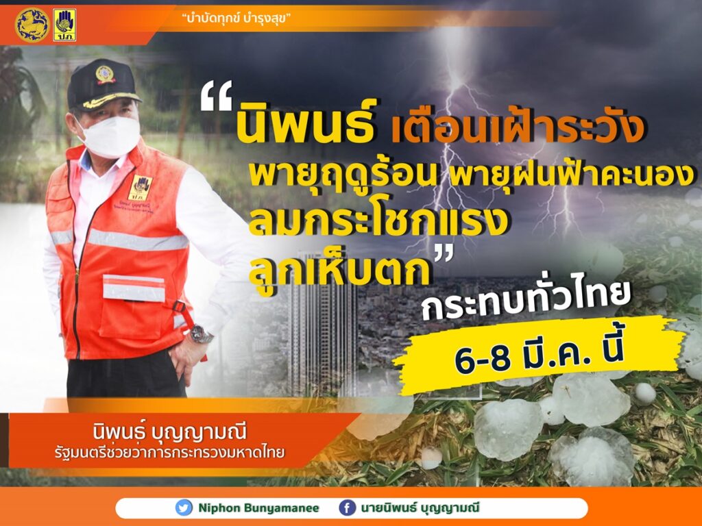 กรุงเทพฯ 5 มี.ค. – “นิพนธ์” รมช.มหาดไทย เตือนเฝ้าระวังพายุฤดูร้อน พายุฝนฟ้าคะนอง และลูกเห็บตก กระทบทั่วไทย ช่วงวันที่ 6-8 มี.ค.นี้