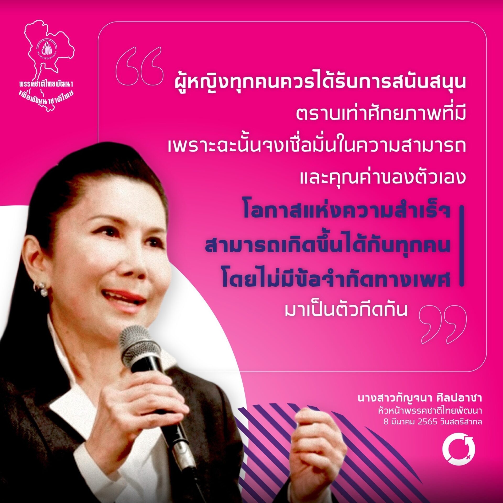 น.ส.กัญจนา ศิลปอาชา หัวหน้าพรรคชาติไทยพัฒนา นักการเมืองสตรีที่ผลักดันให้เกิดความเท่าเทียมทางเพศ โพสต์เฟซบุ๊กเนื่องในวันสตรีสากล ระบุว่า วันนี้ในอดีตคือจุดเริ่มต้นของความเท่าเทียมทางเพศ วันที่ผู้หญิงลุกขึ้นมาต่อสู้เพื่อสิทธิความเท่าเทียมทางสังคม วันที่ 8 มีนาคมของทุกปี จึงเปรียบเสมือนสัญลักษณ์แห่งโอกาสและบทบาทของสตรีที่พัฒนาเปลี่ยนแปลงไปตามยุคสมัย ซึ่งตนขอเชิดชูเกียรติผู้หญิงทุกคนไม่ว่าจะอยู่ในสถาบันวิชาชีพใด บทบาทใดทางสังคม ผู้หญิงทุกคนล้วนมีคุณค่าในตัวเอง