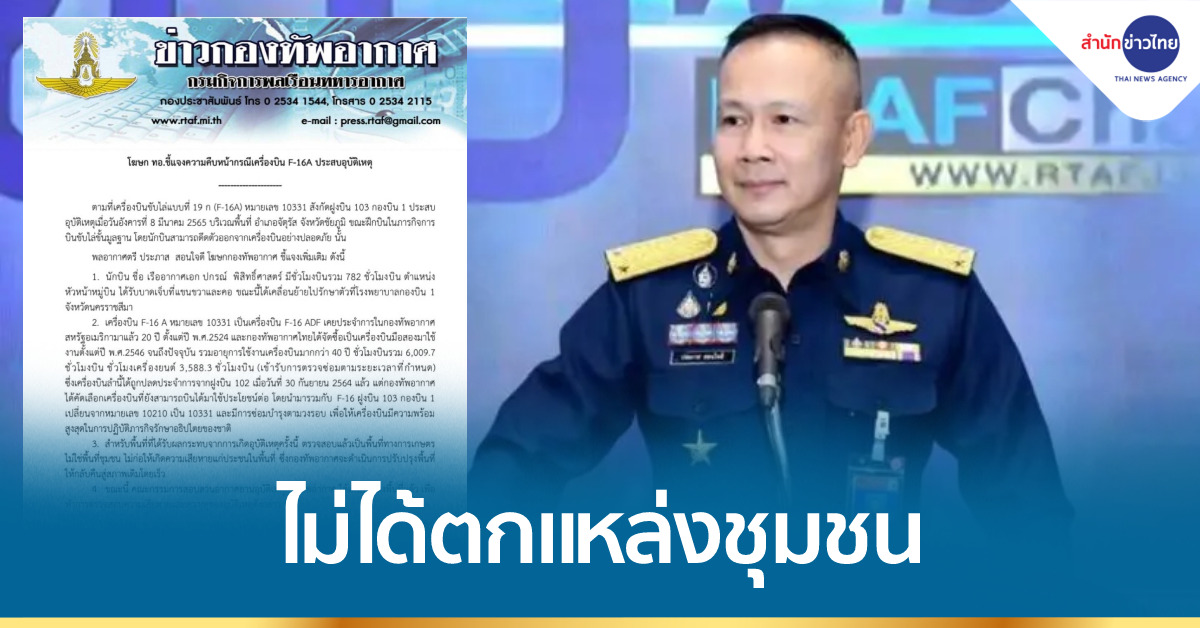 อย่างไรก็ตาม กองทัพอากาศขอแสดงความเสียใจต่อเหตุการณ์ที่เกิดขึ้น และขอขอบคุณประชาชนในพื้นที่ ตลอดจนทีมกู้ภัย ที่ให้ความช่วยเหลือนำนักบินส่งโรงพยาบาลอย่างเร่งด่วน และขอความร่วมมือประชาชนในพื้นที่ อย่าเข้าใกล้พื้นที่อากาศยานอุบัติเหตุเพราะอาจเป็นอันตรายได้.-สำนักข่าวไทย