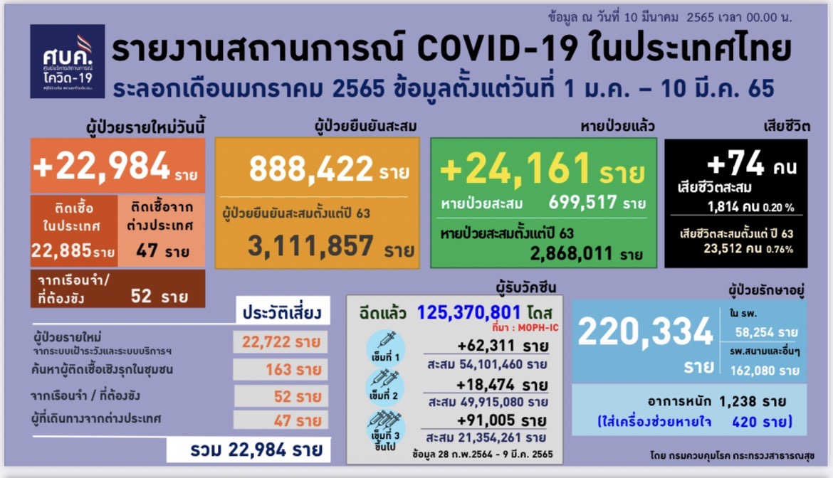 ทำเนียบรัฐบาล 10 มี.ค.-ศบค.เผย ติดเชื้อโควิดในไทยยังพุ่ง 22,984 ราย ตายเพิ่ม 74 ราย พบผู้ป่วยใส่ท่อช่วยหายใจ โรคปอดอักเสบพิ่มขึ้น