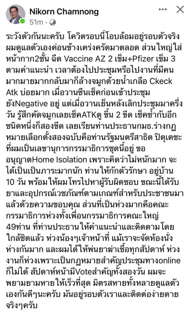 เบื้องต้นได้แจ้งให้ นายสาธิต ปิตุเตชะ รมช.สาธารณสุข ในฐานะ ประธาน กมธ.ร่างกฏหมายลูกเลือกตั้งทราบแล้ว และขออนุญาต Home Isolation เพราะคิดว่าไม่หนักมาก จะได้เป็นเป็นภาระมากนัก ซึ่งท่านให้กักตัวรักษา อยู่บ้าน 10 วัน พร้อมให้ผมโทรไปหาผู้รับผิดชอบ ขณะนี้ได้รับยาและอุปกรณ์เวชภัณฑ์ตามเกณฑ์สำหรับประชาชนมาแล้วด้วยความขอบคุณ