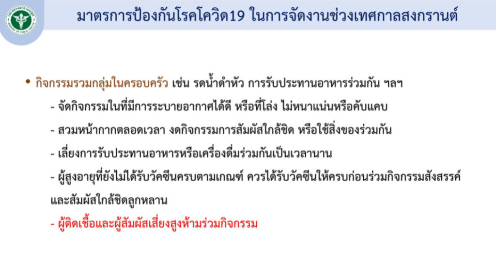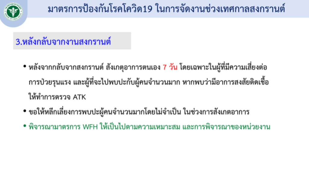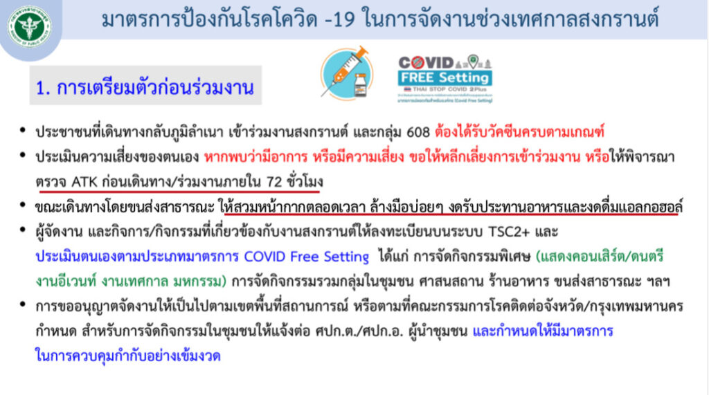 พร้อมทั้งได้กำหนดมาตรการป้องกันโควิด-19 โดยการเตรียมตัวก่อนร่วมงาน ประชาชนที่จะเดินทางกลับภูมิลำเนา และกลุ่ม 608 ต้องได้รับวัคซีนตามเกณฑ์ ขณะเดินทางกลับห้ามดื่มเครื่องดื่มแอลกอฮอล์ และต้องประเมินความเสี่ยงของตนเอง หากพบว่ามีอาการ หรือมีความเสี่ยง ขอให้หลีกเลี่ยงเข้าร่วมงาน หรือตรวจ ATK ก่อนเดินทางหรือก่อนร่วมงานภายใน 72 ชั่วโมง