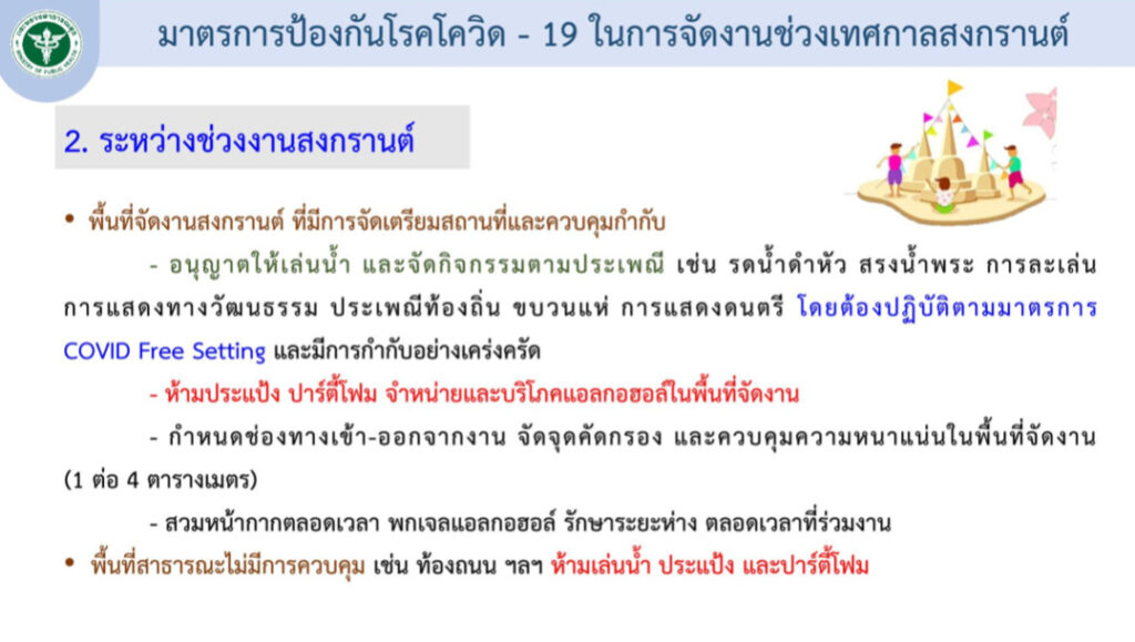 ส่วนพื้นที่สาธารณะไม่มีการควบคุม เช่น ท้องถนน ห้ามเล่นน้ำ ประแป้ง และปาร์ตี้โฟมเด็ดขาด ส่วนกิจกรรมในครอบครัว เลี่ยงการรับประทานอาหารหรือเครื่องดื่มเป็นเวลานาน