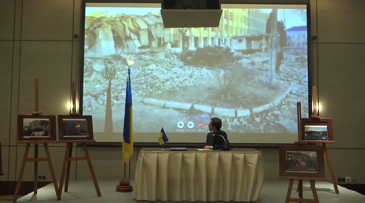 ในระหว่างการแถลง ยังได้มีการนำภาพสดจากเมืองซีโตเมียร์ ทางเหนือของกรุงเคียฟ เพื่อแสดงถึงการทำลายล้างโรงเรียนและบ้านเรือนประชาชน ให้สื่อมวลชนชมด้วย. – สำนักข่าวไทย
