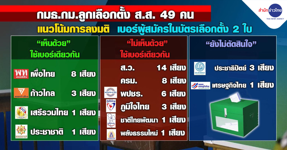 กรุงเทพฯ 29 มี.ค. – คณะกรรมาธิการพิจารณากฎหมายลูกว่าด้วยการเลือกตั้ง ส.ส. เตรียมลงมติประเด็นหมายเลขผู้สมัคร ส.ส.เขต และบัญชีรายชื่อ ว่าจะใช้หมายเลขเดียวกันหรือต่างหมายเลขในวันพรุ่งนี้ (30 มี.ค.) .-สำนักข่าวไทย