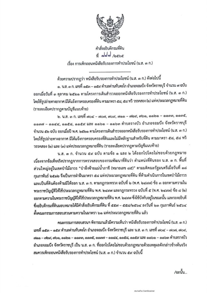 น.ส. 3 ก. จำนวน 59 ฉบับ ได้ออกไปโดยไม่ชอบด้วยกฎหมาย ซึ่งจากข้อเท็จจริงปรากฏจากการตรวจสอบของกรมพัฒนาที่ดินว่า ตำแหน่งที่ดินของ น.ส. 3 ก. พื้นที่ส่วนใหญ่อยู่ในเขตป่าไม้ถาวร “ป่าฝั่งซ้ายแม่น้ำภาชี (หมายเลข 85)” ตามมติคณะรัฐมนตรี (ครม.) เมื่อวันที่ 18 ก.พ. 2512 จึงเป็นการฝ่าฝืนมาตรา 58 แห่งประมวลกฎหมายที่ดิน ที่ห้ามดำเนินการในเขตป่าไม้ถาวรและเป็นที่ดินต้องห้ามมิให้ออก น.ส. 3 ก. ตามกฎกระทรวง ฉบับที่ 2 (พ.ศ. 2497) ข้อ 3 ออกตามความในพระราชบัญญัติ (พ.ร.บ.) ให้ใช้ประมวลกฎหมายที่ดิน พ.ศ. 2497 และกฎกระทรวง ฉบับที่ 5 (พ.ศ. 2497) ข้อ 8 (2) ออกตามความใน พ.ร.บ.ให้ใช้ประมวลกฎหมายที่ดิน พ.ศ. 2497 ซึ่งใช้บังคับอยู่ในขณะนั้น และรองอธิบดีซึ่งอธิบดีกรมที่ดินมอบหมายได้มีคำสั่งอธิบดีกรมที่ดิน ที่ 557 – 558/2564 ลงวันที่ 23 ก.พ. 2564 ตั้งคณะกรรมการสอบสวนตามความในมาตรา 61 แห่งประมวลกฎหมายที่ดินแล้ว