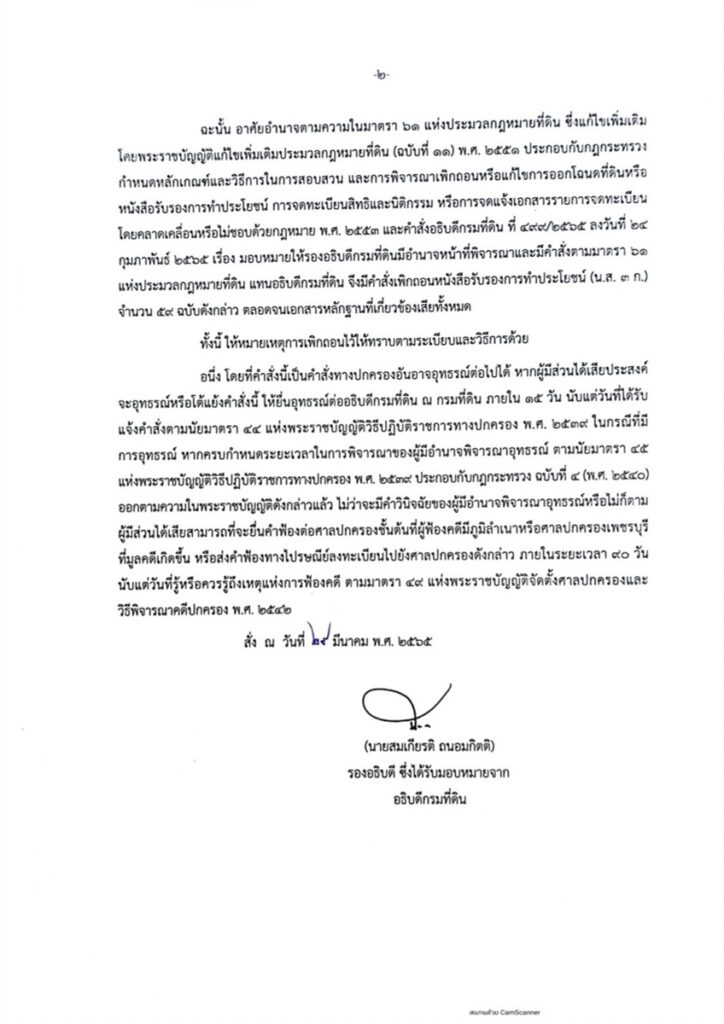 อนึ่ง โดยที่คำสั่งนี้เป็นคำสั่งทางปกครองอันอาจอุทธรณ์ต่อไปได้ หากผู้มีส่วนได้เสียประสงค์จะอุทธรณ์หรือโต้แย้งคำสั่งนี้ ให้ยื่นอุทธรณ์ต่ออธิบดีกรมที่ดิน ณ กรมที่ดิน ภายใน 15 วัน นับแต่วันที่ได้รับแจ้งคำสั่งตามนัยมาตรา 44 แห่ง พ.ร.บ.วิธีปฏิบัติราชการทางปกครอง พ.ศ. 2539 ในกรณีที่มีการอุทธรณ์ หากครบกำหนดระยะเวลาในการพิจารณาของผู้มีอำนาจพิจารณาอุทธรณ์ ตามนัยมาตรา 45 แห่ง พ.ร.บ.วิธีปฏิบัติราชการทางปกครอง พ.ศ. 2539 ประกอบกับกฎกระทรวง ฉบับที่ 4 (พ.ศ. 2540) ออกตามความใน พ.ร.บ.ดังกล่าวแล้ว ไม่ว่าจะมีคำวินิจฉัยของผู้มีอำนาจพิจารณาอุทธรณ์หรือไม่ก็ตาม ผู้มีส่วนได้เสียสามารถที่จะยื่นคำฟ้องต่อศาลปกครองชั้นต้นที่ผู้ฟ้องคดีมีภูมิลำเนา หรือศาลปกครองเพชรบุรีที่มูลคดีเกิดขึ้น หรือส่งคำฟ้องทางไปรษณีย์ลงทะเบียนไปยังศาลปกครองดังกล่าว ภายในระยะเวลา 90 วัน นับแต่วันที่รู้หรือควรรู้ถึงเหตุแห่งการฟ้องคดี ตามมาตรา 49 แห่ง พ.ร.บ.จัดตั้งศาลปกครองและวิธีพิจารณาคดีปกครอง พ.ศ. 2542 สั่ง ณ วันที่ 29 มี.ค. 2565