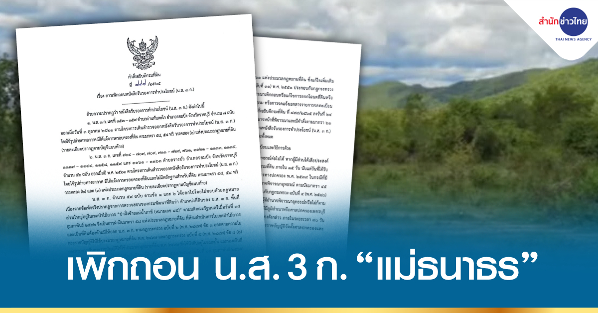 ผู้สื่อข่าวรายงานว่า นายสมเกียรติ ถนอมกิตติ รองอธิบดีกรมที่ดิน ได้รับมอบหมายจากอธิบดีกรมที่ดิน ลงนามคำสั่งวันนี้ (29 มี.ค.) เรื่อง การเพิกถอนหนังสือรับรองการทำประโยชน์ (น.ส. 3 ก.) ของนางสมพร จึงรุ่งเรืองกิจ มารดานายธนาธร จึงรุ่งเรืองกิจ ประธานคณะก้าวหน้า รวมถึงนายธนาธร และ น.ส.ชนาพรรณ จึงรุ่งเรืองกิจ ที่ครอบครองที่ดินในเขตป่าไม้ถาวร อ.จอมบึง จ.ราชบุรี จำนวน 59 ฉบับ เนื้อที่รวม 2,111-1-69 ไร่ ระบุว่า น.ส. 3 ก. เลขที่ 153 – 159 ต.ด่านทับตะโก อ.จอมบึง จ.ราชบุรี จำนวน 7 ฉบับ ออกเมื่อวันที่ 3 ต.ค. 2521 ตามโครงการเดินสำรวจออกหนังสือรับรองการทำประโยชน์ น.ส. 3 ก. โดยใช้รูปถ่ายทางอากาศ มิได้แจ้งการครอบครองที่ดิน ตามมาตรา 58, 58 ทวิ วรรคสอง (2) แห่งประมวลกฎหมายที่ดิน