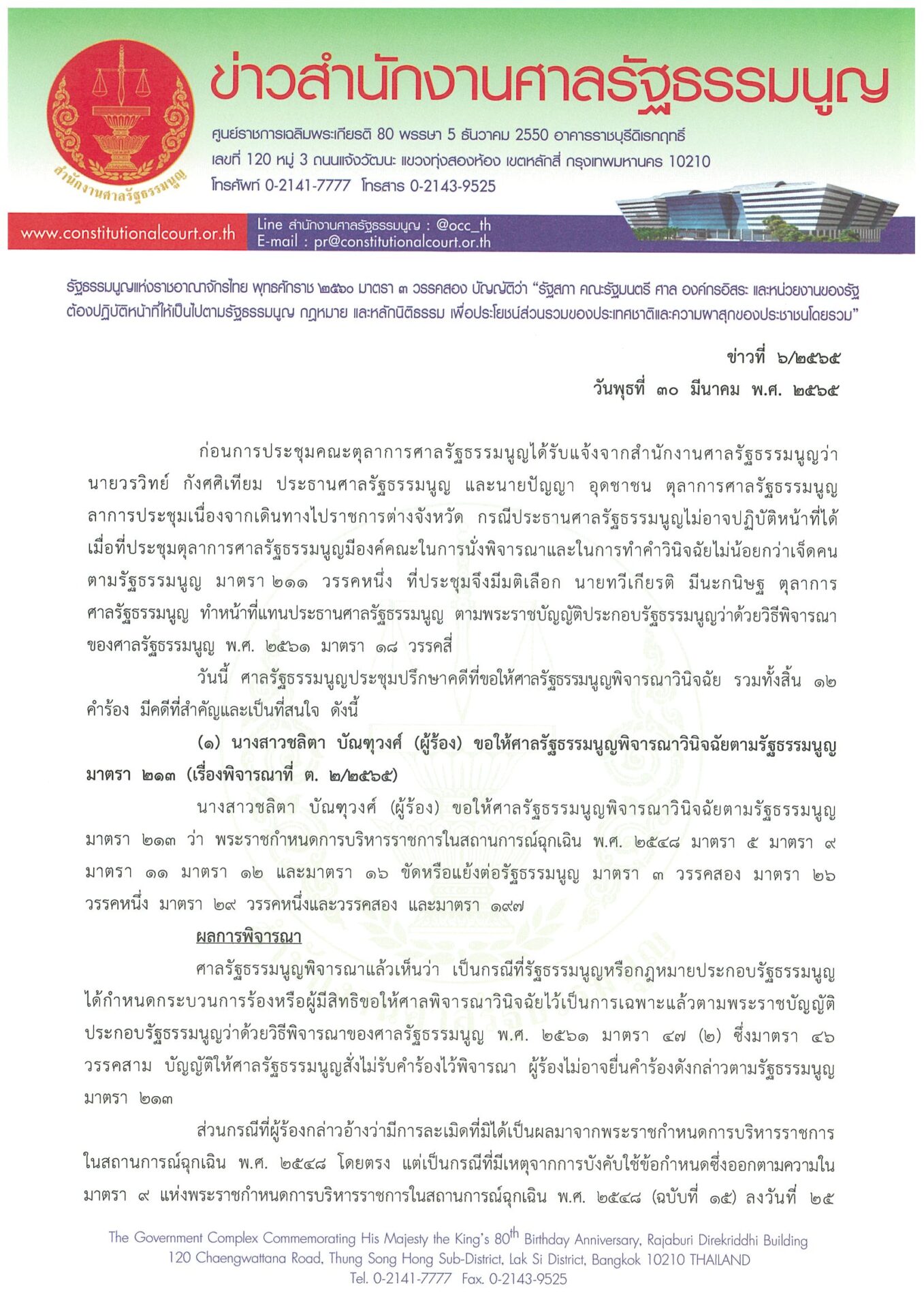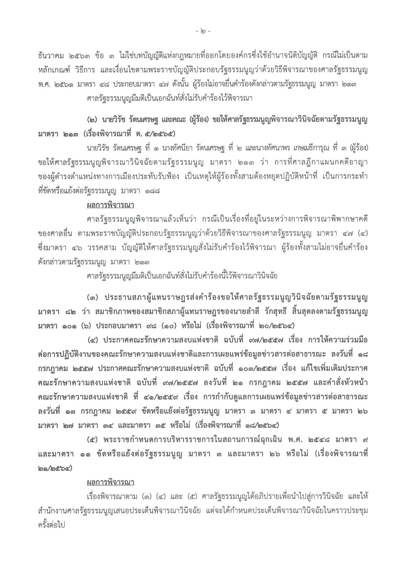 ศาลรัฐธรรมนูญ 30 มี.ค. – “วิรัช-ภรรยา-น้องเมีย” อด หลังศาลรัฐธรรมนูญตีตกคำร้องขอตีความศาลฎีกาสั่งหยุดปฏิบัติหน้าที่ เหตุทุจริตคดีฟุตซอลขัด รธน. พร้อมไม่รับปม “ชลิตา” ขอวินิจฉัย พ.ร.ก.ฉุกเฉิน ขัด รธน.