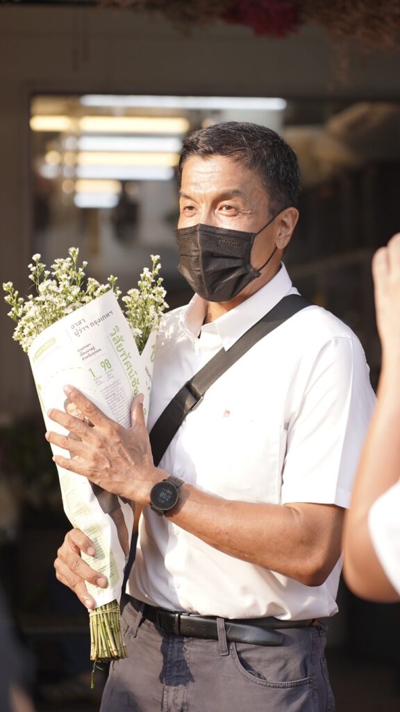 ที่ปากคลองตลาด “ชัชชาติ” รับช่อดอกไม้จากผู้ค้าในพื้นที่ ดอกไม้ห่อจากกระดาษแผ่นพับหาเสียง สอดคล้องกับแนวคิด “หาเสียงรักเมือง” ที่เชิญชวนให้ผู้ได้รับแผ่นพับหาเสียงนำกลับไปใช้ซ้ำเพื่อลดปริมาณขยะ แนวคิดดังกล่าวรวมถึงการลดขนาด-ลดจำนวนป้ายหาเสียง และใช้พาหนะไฟฟ้า (EV) สำหรับใช้รณรงค์หาเสียงด้วย .-สำนักข่าวไทย