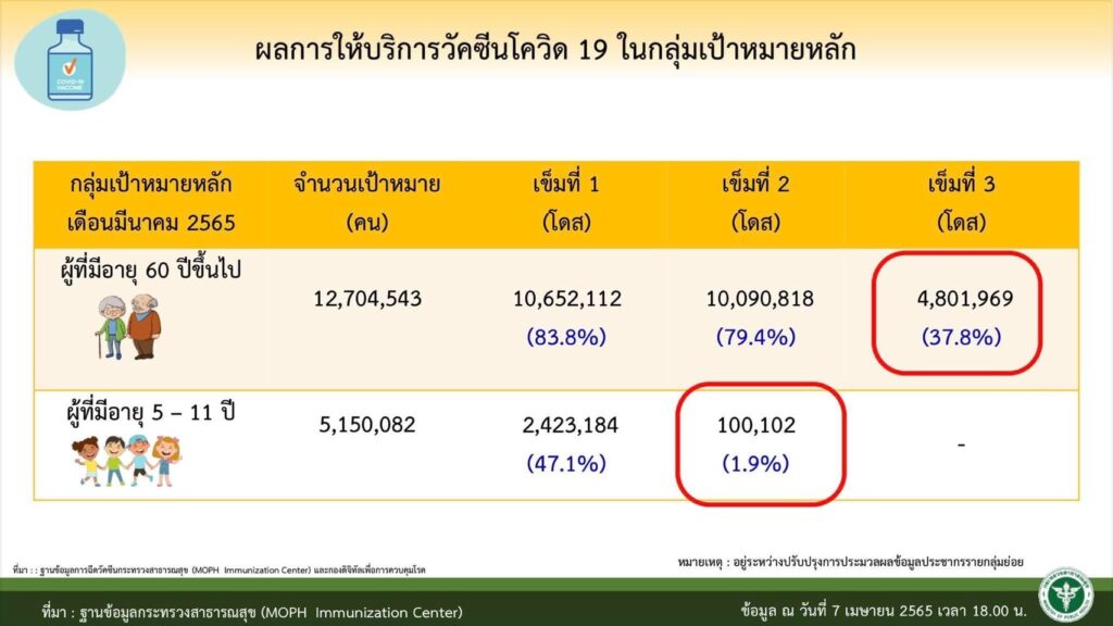 นพ.ทวีศิลป์ วิษณุโยธิน โฆษกศูนย์บริหารสถานการณ์การแพร่ระบาดของโรคติดเชื้อไวรัสโคโรนา 2019 (โควิด-19) หรือ ศบค. แถลงผลการประชุม ศบค.ชุดใหญ่ ว่า ที่ประชุม ศบค.รายงานว่าการฉีดวัคซีนผู้สูงอายุเข็ม 3 ไปแล้ว 37 % ซึ่งหลายฝ่ายมีข้อห่วงใย เพราะสายพันธุ์โอไมครอน ต้องฉีดวัคซีน 3 เข็ม โดย 60% ยังไม่ได้มีการฉีดวัคซีนจะทำให้ติดเชื้อและเสียชีวิตได้ ขณะเดียวกันการฉีดวัคซีนในเด็กเข็มที่ 2 มีเพียง 1.9 % ยังถือว่าต่ำ และพบว่าเด็กป่วยและเสียชีวิต ถึงแม้ไม่มากแต่ก็จะต้องช่วยกัน