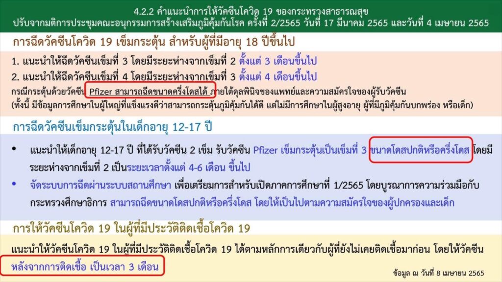 นพ.ทวีศิลป์ กล่าวว่า ที่ประชุมยังเห็นชอบการฉีดวัคซีนกระตุ้นด้วยไฟเซอร์ สามารถฉีดขนาดครึ่งโดดได้ ซึ่งขึ้นอยู่กับดุลยพินิจของแพทย์และความสมัครใจของผู้รับวัคซีน รวมถึงในเด็กอายุ 12 ถึง 17 ปี ที่ได้รับวัคซีน 2 เข็มรับวัคซีนไฟเซอร์เข็มกระตุ้นเป็นเข็มที่ 3 สามารถฉีดโดสปกติ หรือครึ่งโดสก็ได้ ทั้งนี้ในส่วนของผู้ที่เคยมีประวัติติดเชื้อโควิด-19 โดยให้ฉีดวัคซีนหลังจากการติดเชื้อเป็นเวลา 3 เดือน ส่วนการฉีดภูมิคุ้มกันสำเร็จรูป (Passive immunity) ในกลุ่มเสี่ยงสูงที่ไม่สามารถกระตุ้นภูมิคุ้มกันได้ด้วยวัคซีนโดยเป็นการฉีดเข้ากล้ามเนื้อทุก 6 เดือน ให้มีภูมิต้านทานสามารถป้องกัน โควิด-19 ได้ 6-12 เดือนต่อการให้ 1 ครั้ง